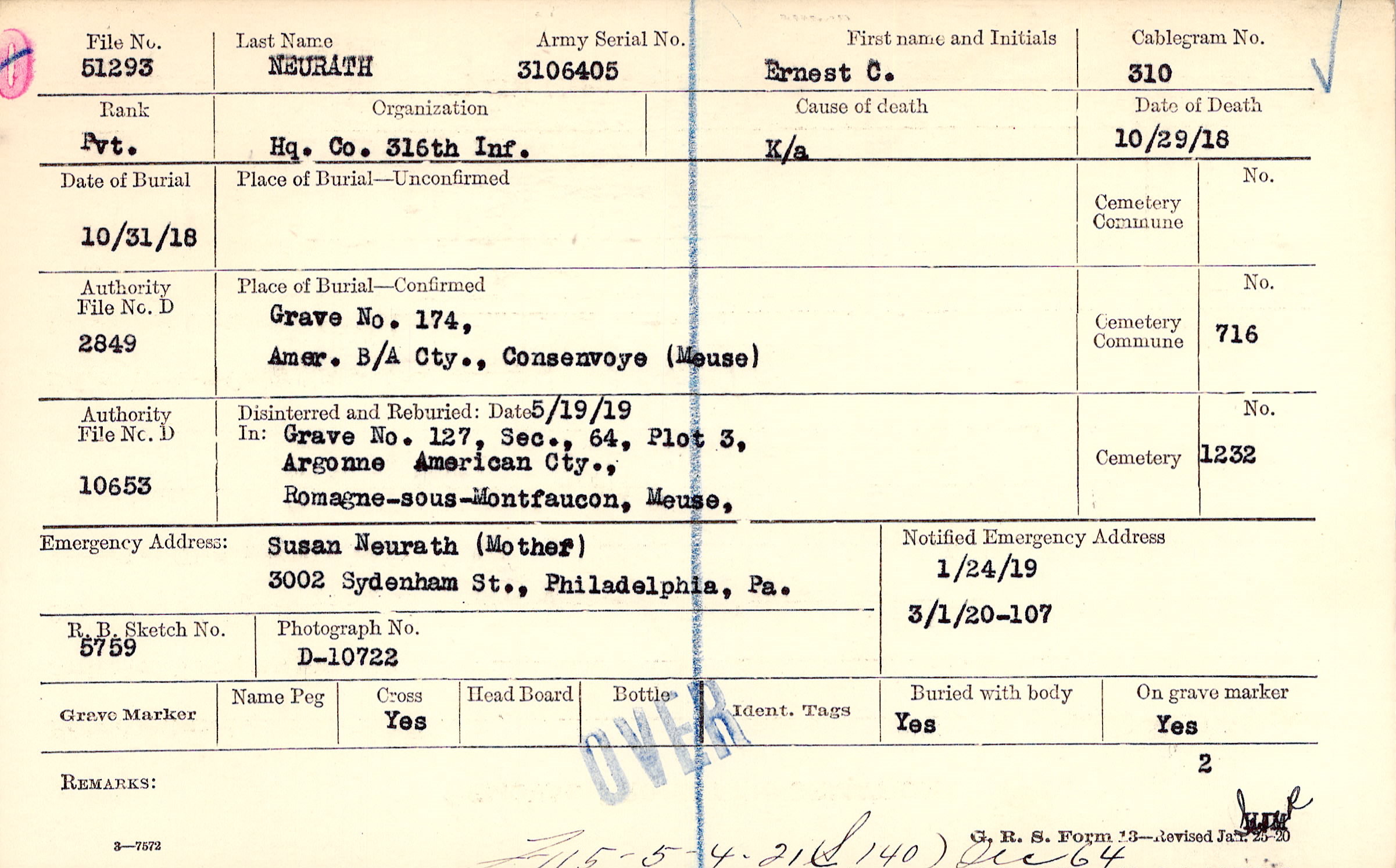 Grave 174, Amer. B/A Cty., Consenvoye, Meuse