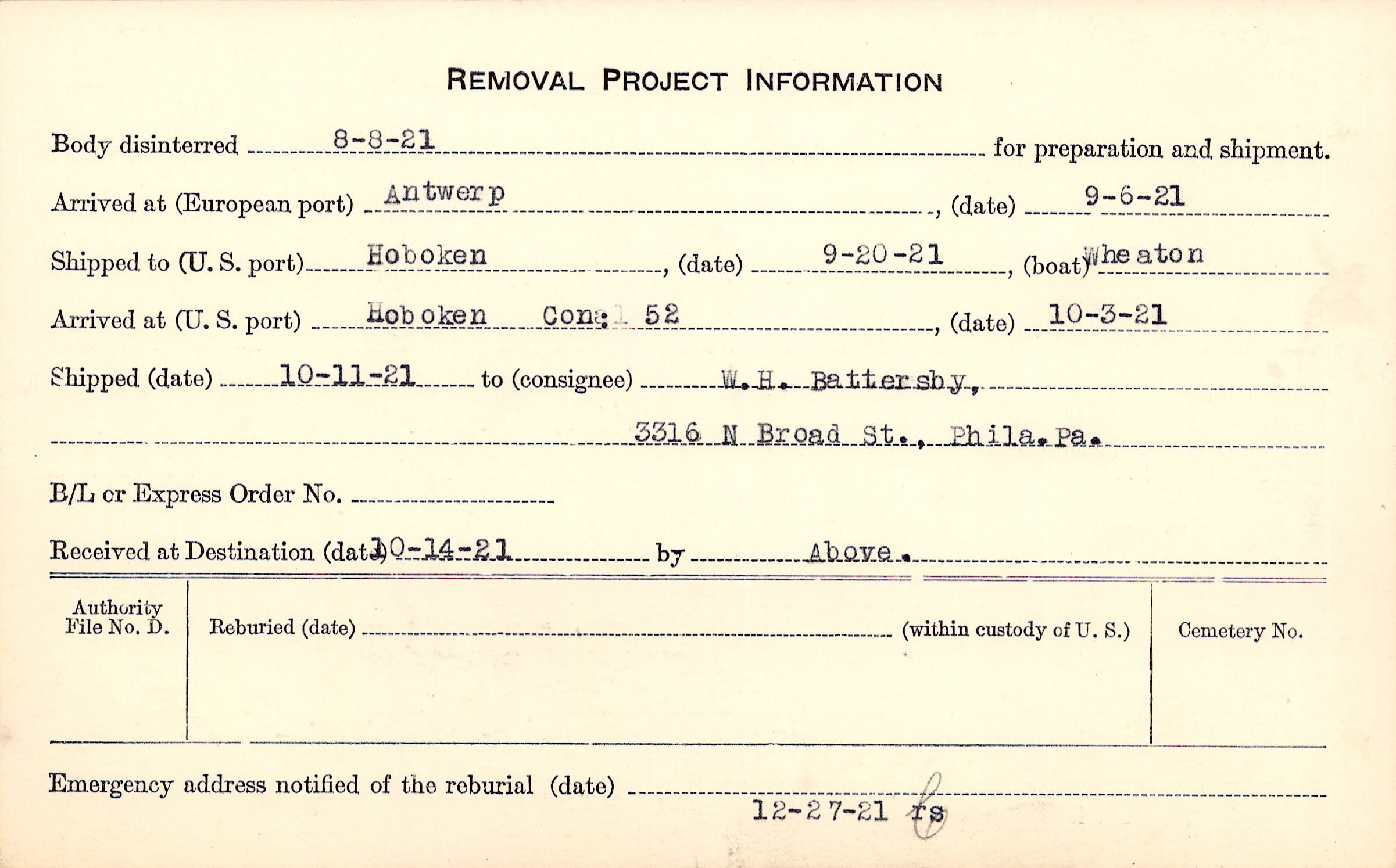 Body disinterred 8/8/1921 for preparation and shipment.