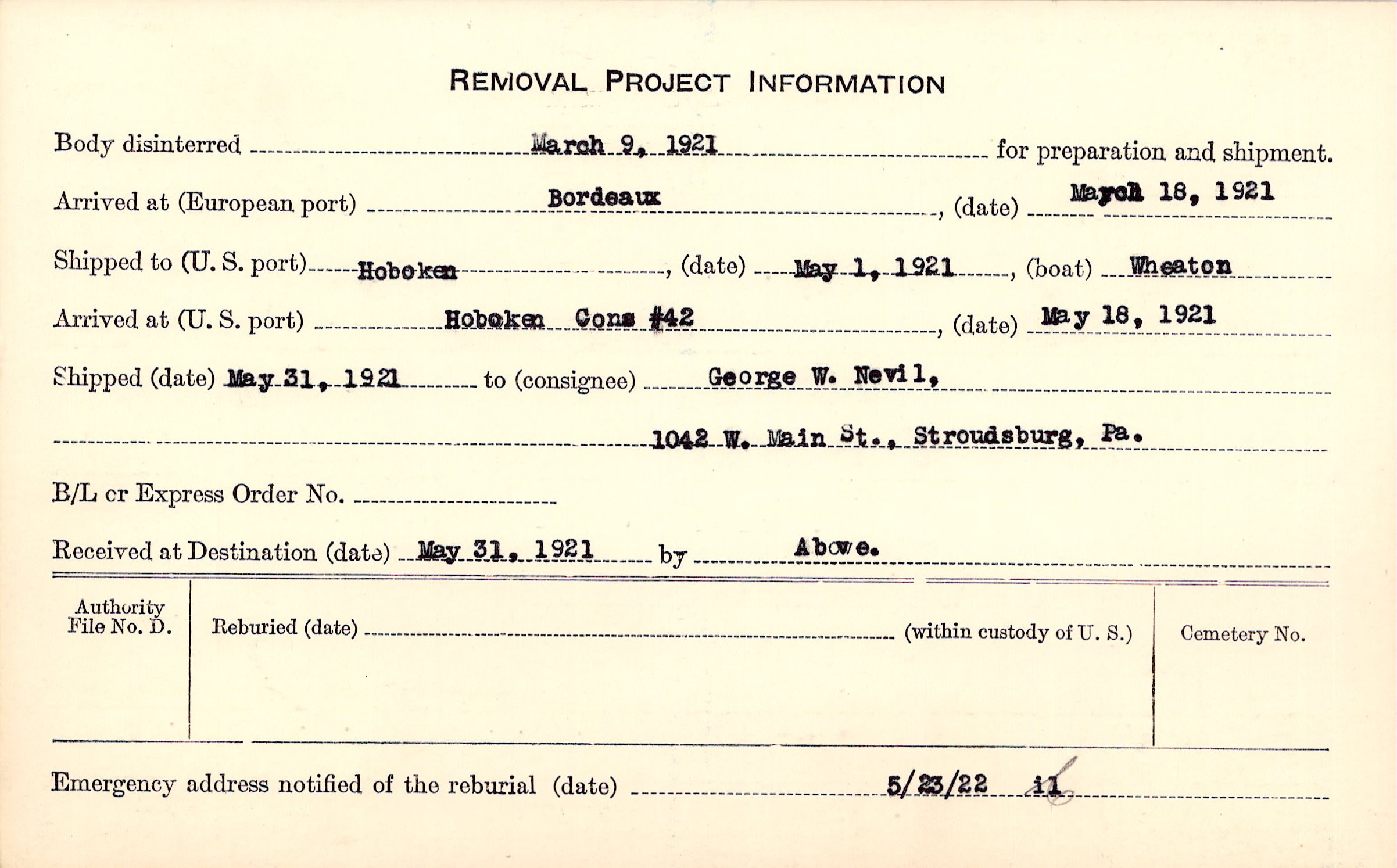 Body disinterred 3/9/1921 for preparation and shipment.