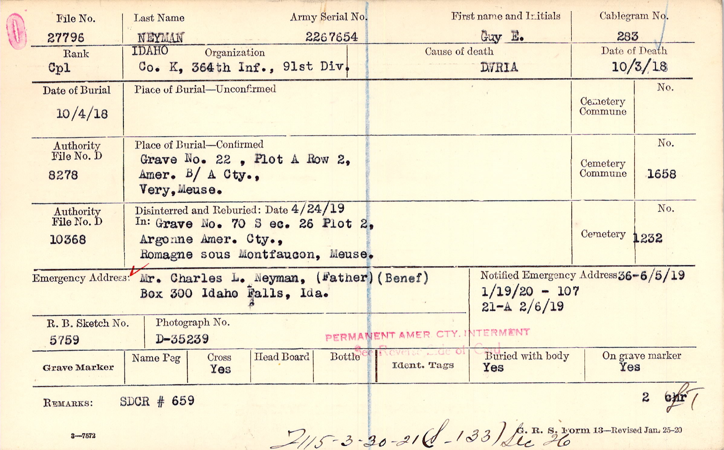 Mr. Charles L. Neyman, (Father), Box 300 Idaho Falls, Ida., (Benef)