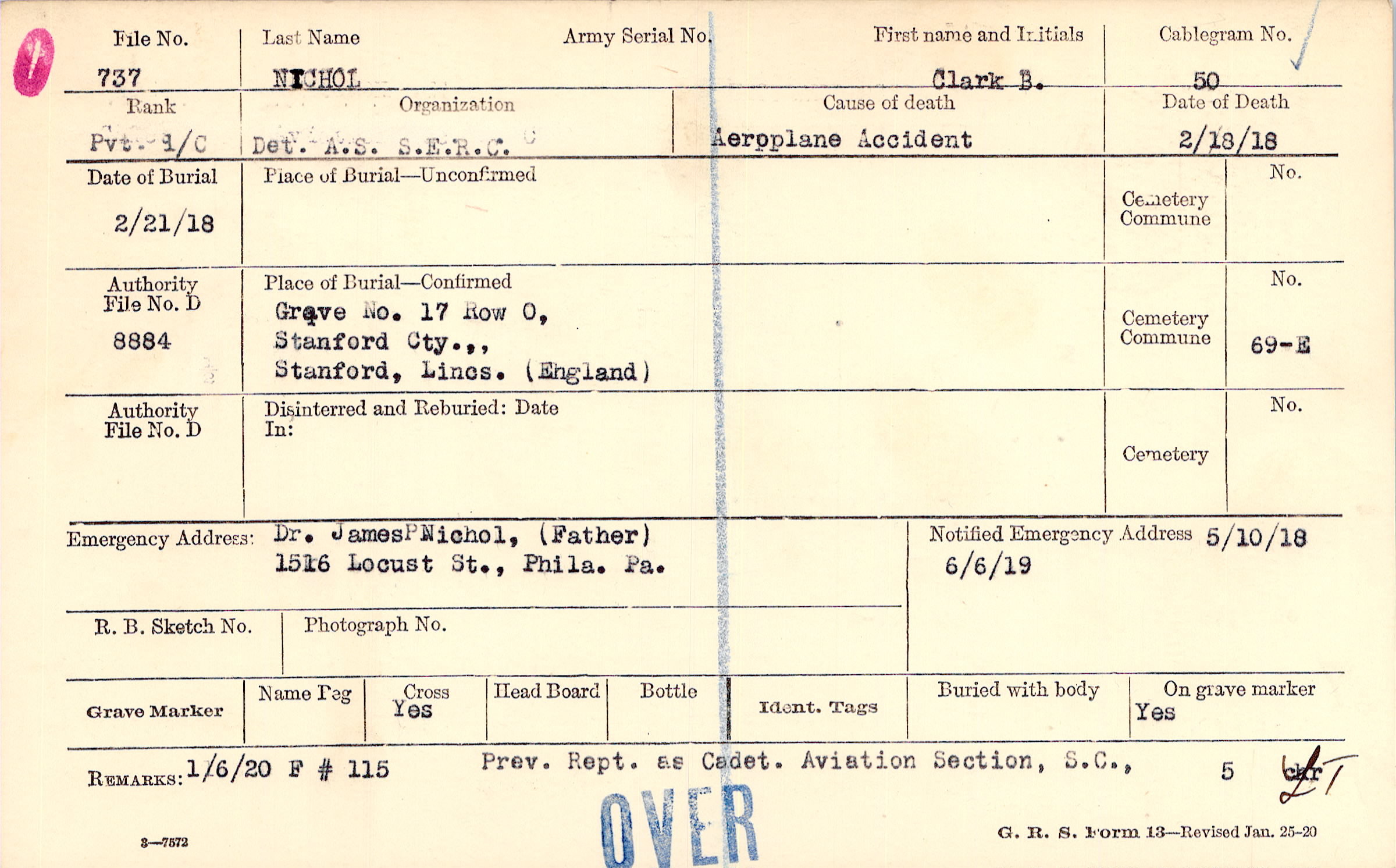 Prev. Rept. as Cadet. Aviation Section, S.C., 1/6/20 F # 115. Prrev. Rept. as Cadet Aviation Section, S.C.,