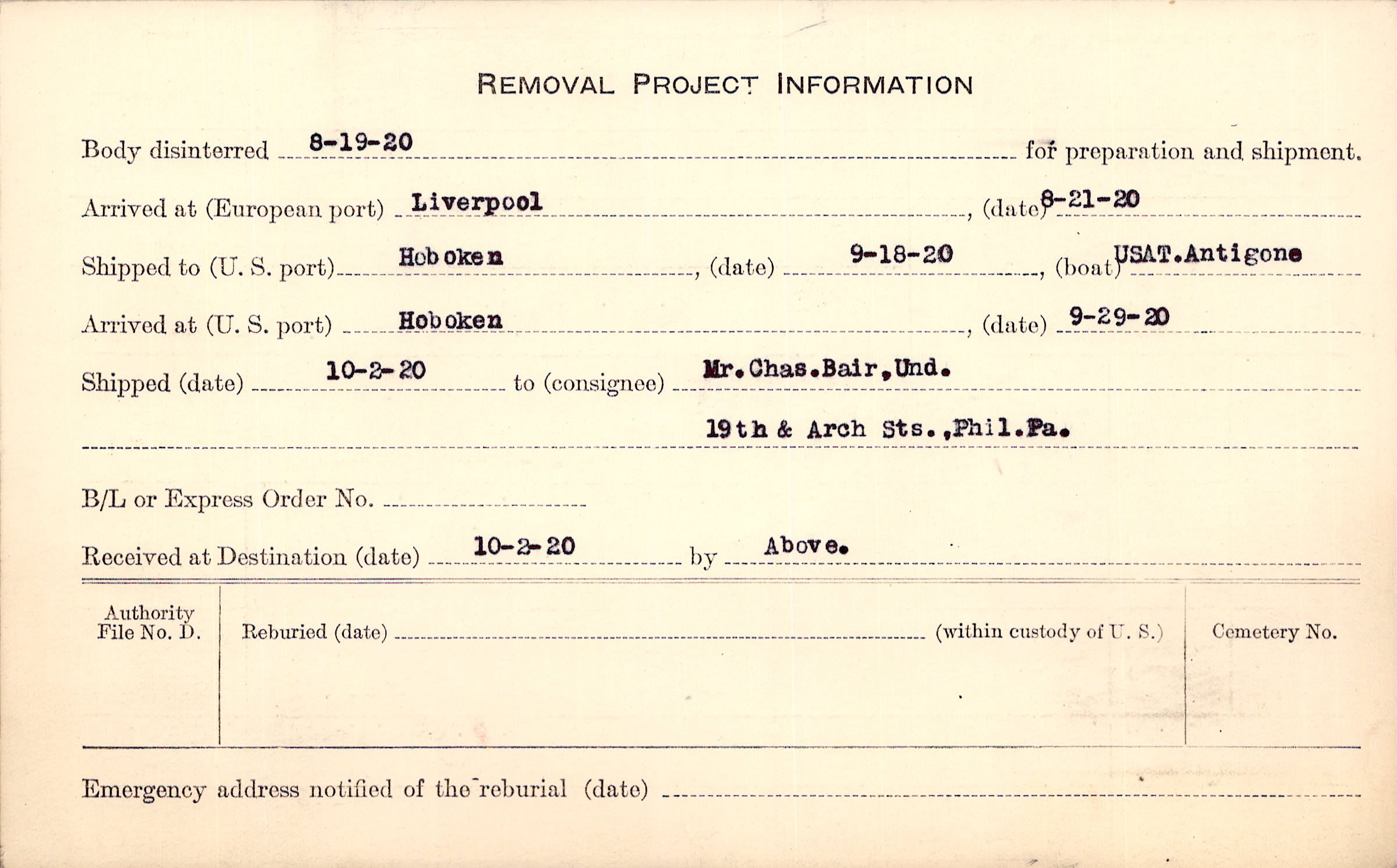 Body disinterred 8/19/1920 for preparation and shipment.