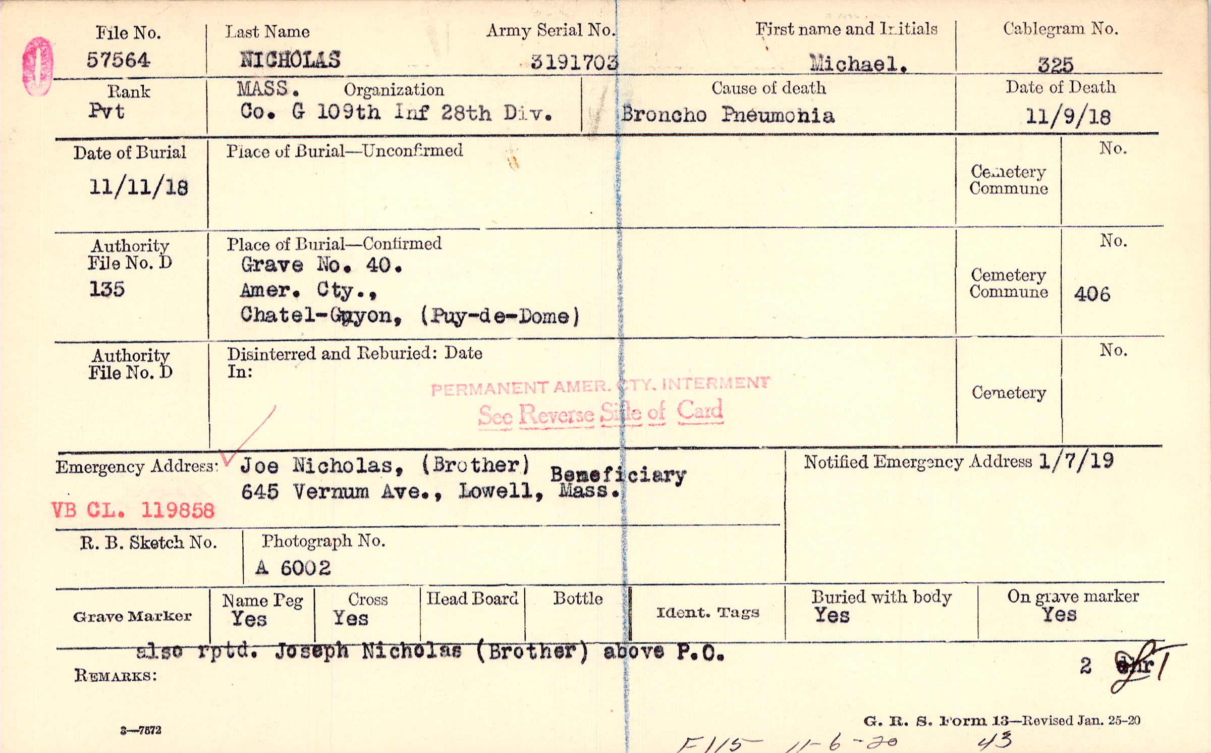 Joe Nicholas, (Brother), 645 Vernum Ave., Lowell, Mass., Beneficiary VB CL. 119858