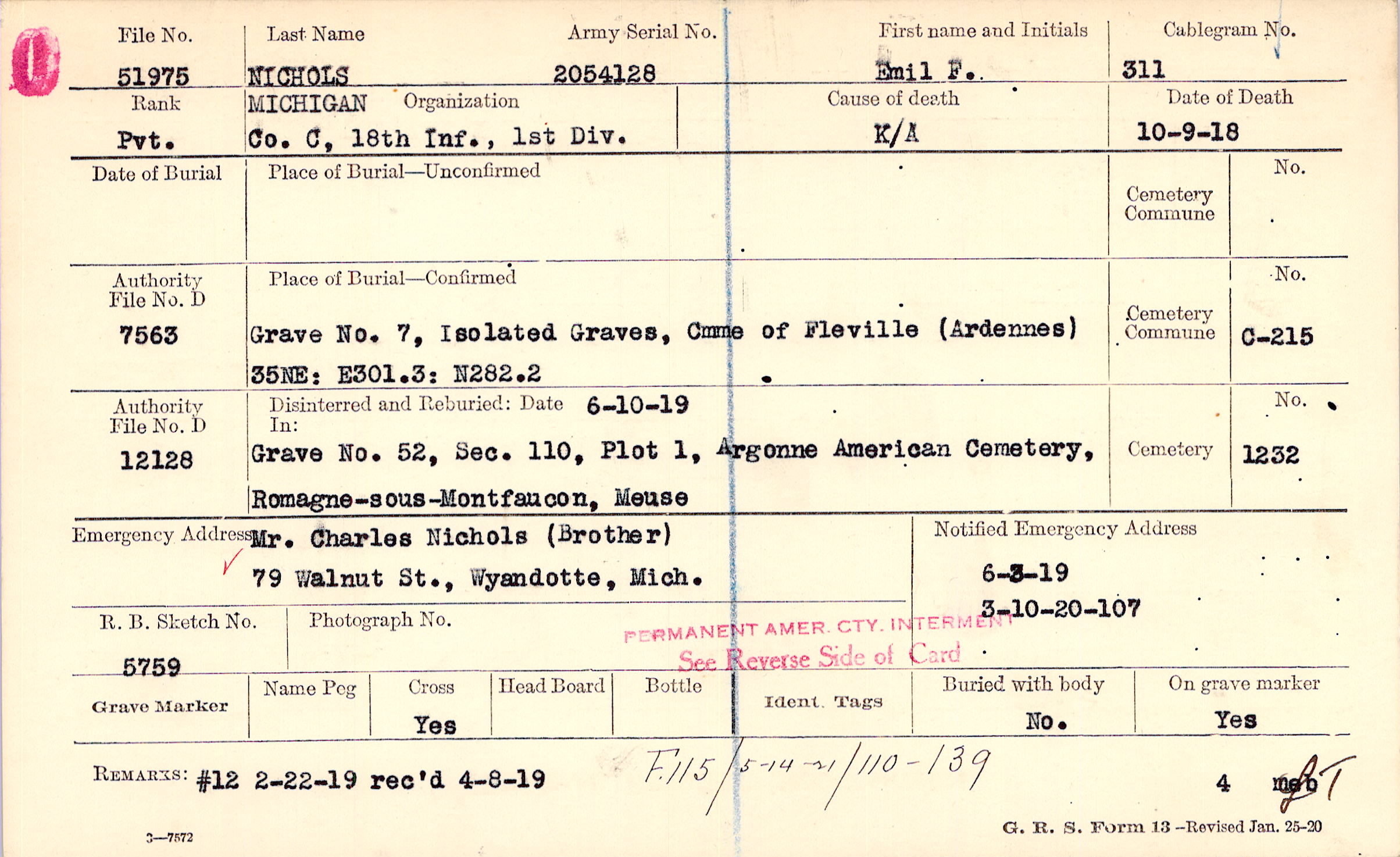 Mr. Charles Nichols (Brother), 79 Walnut St., Wyandotte, Mich.
