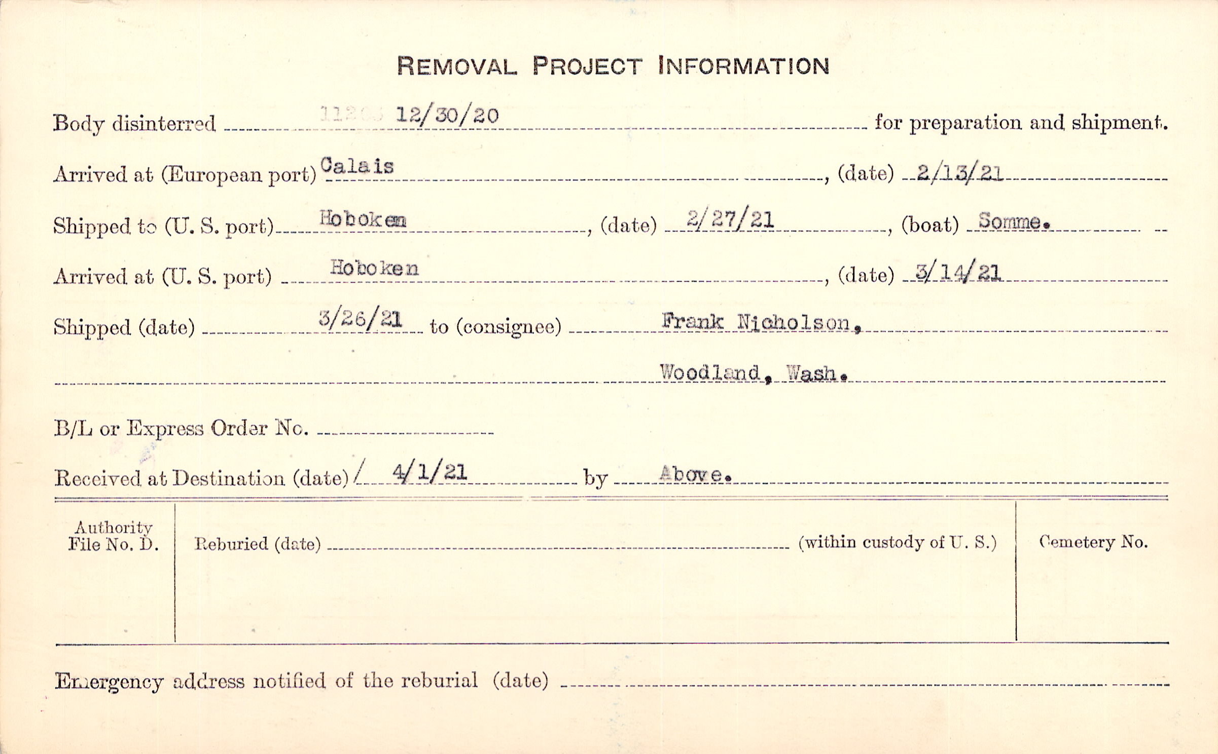 Body disinterred 12/30/1920 for preparation and shipment.