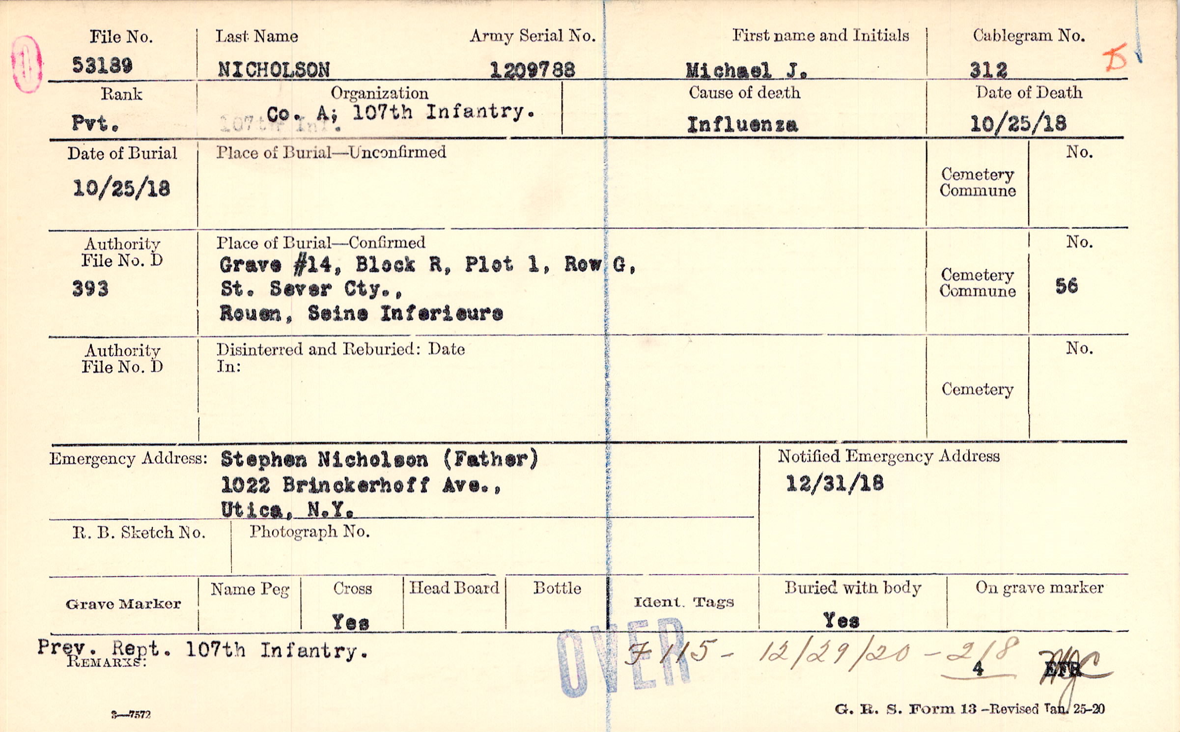 Stephen Nicholson (Father), 1022 Brinckerhoff Ave., Utica, N.Y.