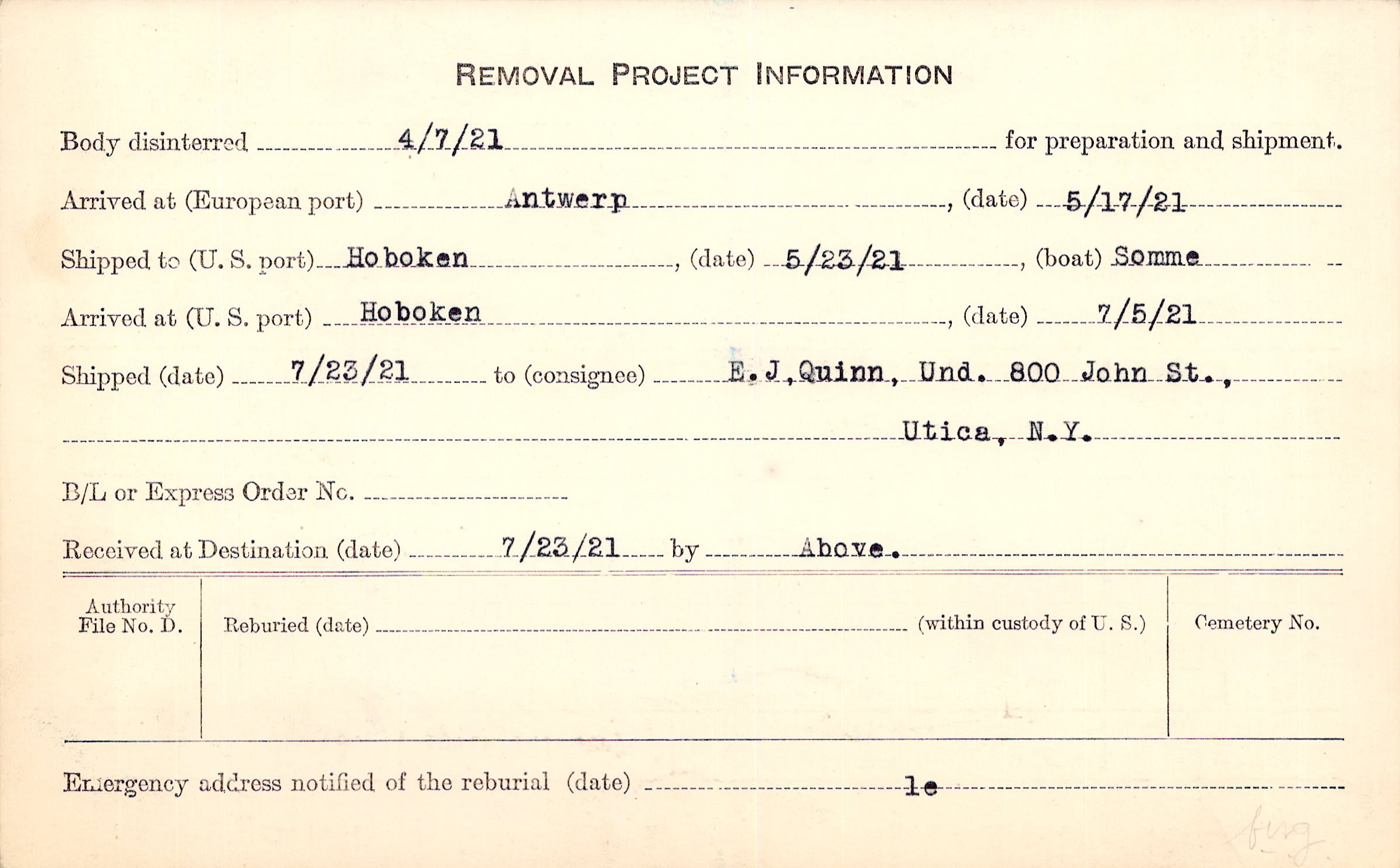 Body disinterred 4/7/1921 for preparation and shipment.