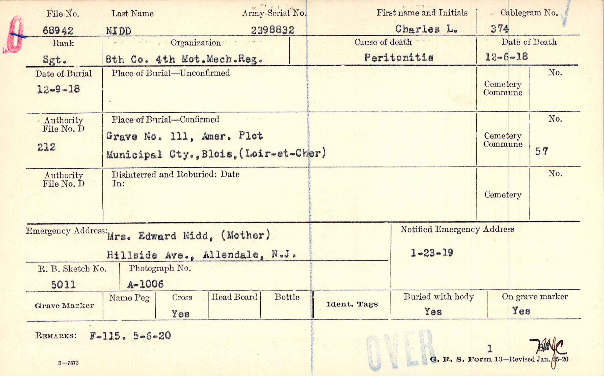 Grave 111, Amer. Plot,Municipal Cty., Blois, Loir-et-Cher.