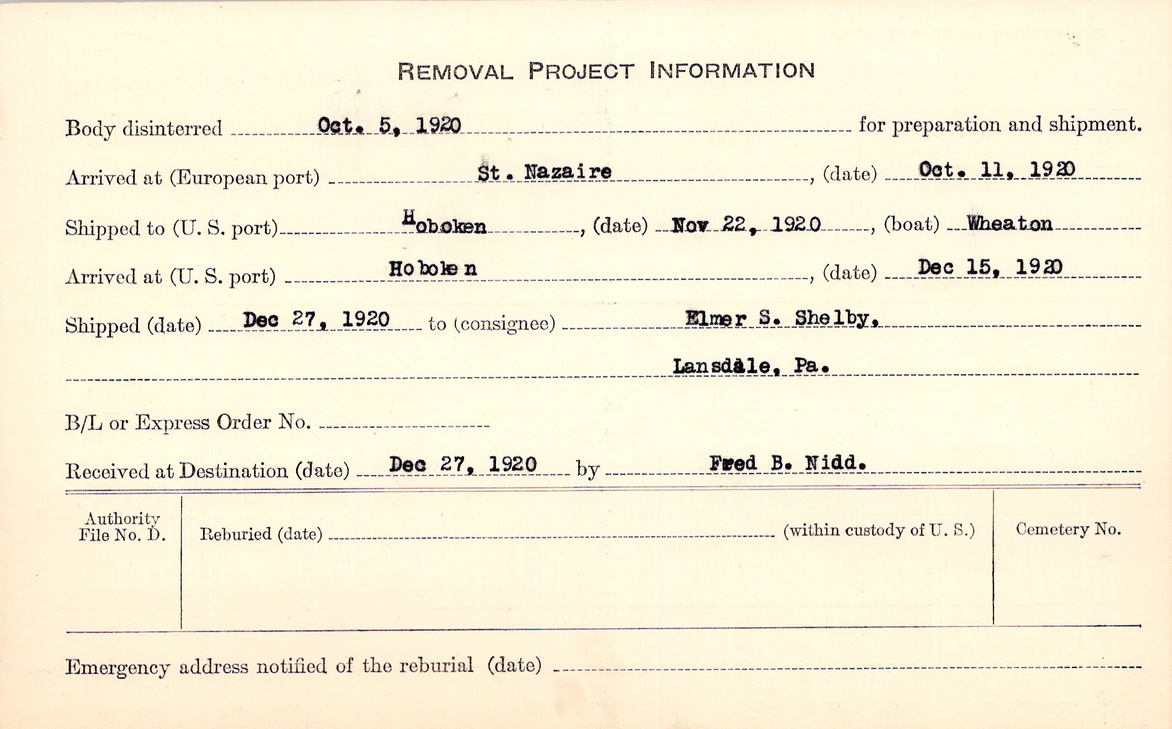 Body disinterred 10/5/1920 for preparation and shipment.