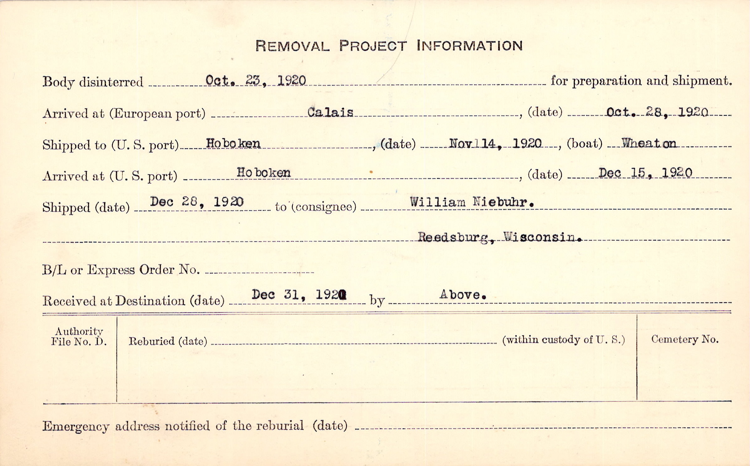 Body disinterred 10/23/1920 for preparation and shipment.