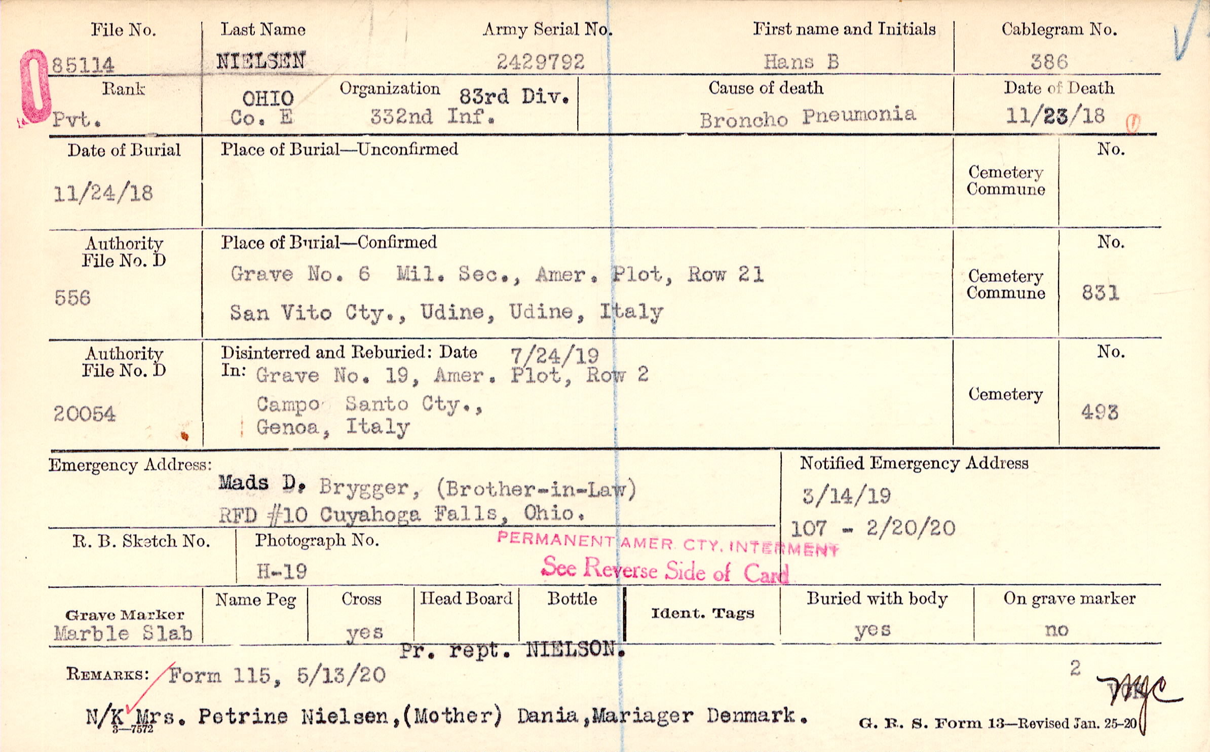 Pr. rept. Nielson. N/K Mrs. Petrine Nielsen, (Mother) Dania, Mariager Denmark, Form 115, 5/13/20