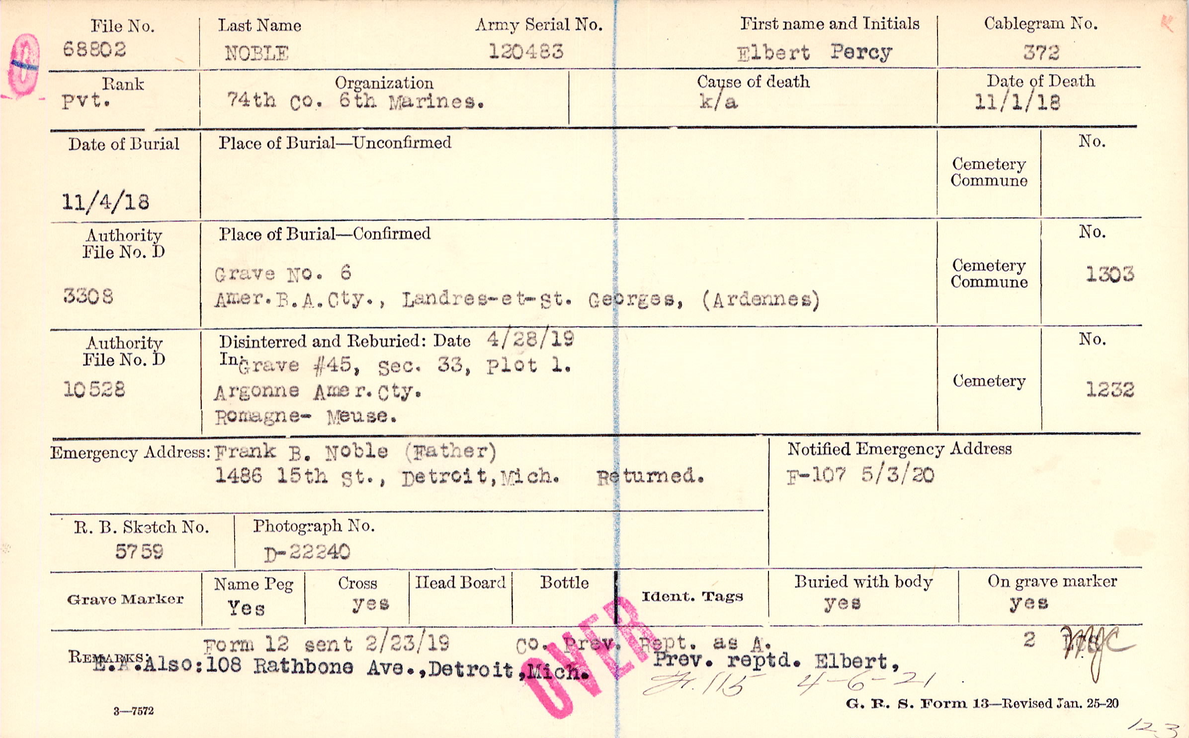 Frank B. Noble, (Father), 1486 15th St., Detroit, Mich., Returned.