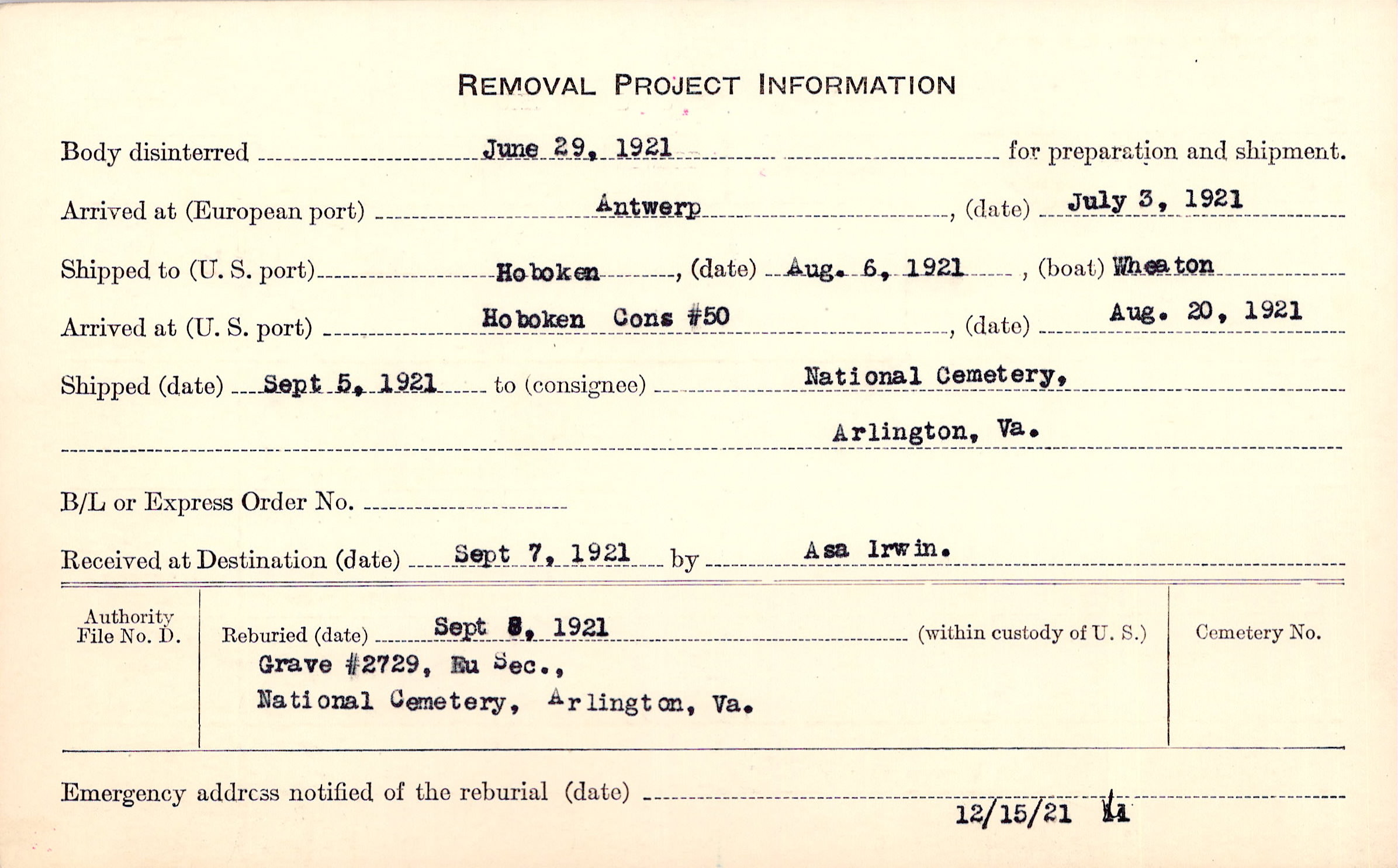 Body disinterred 6/29/1921 for preparation and shipment.
