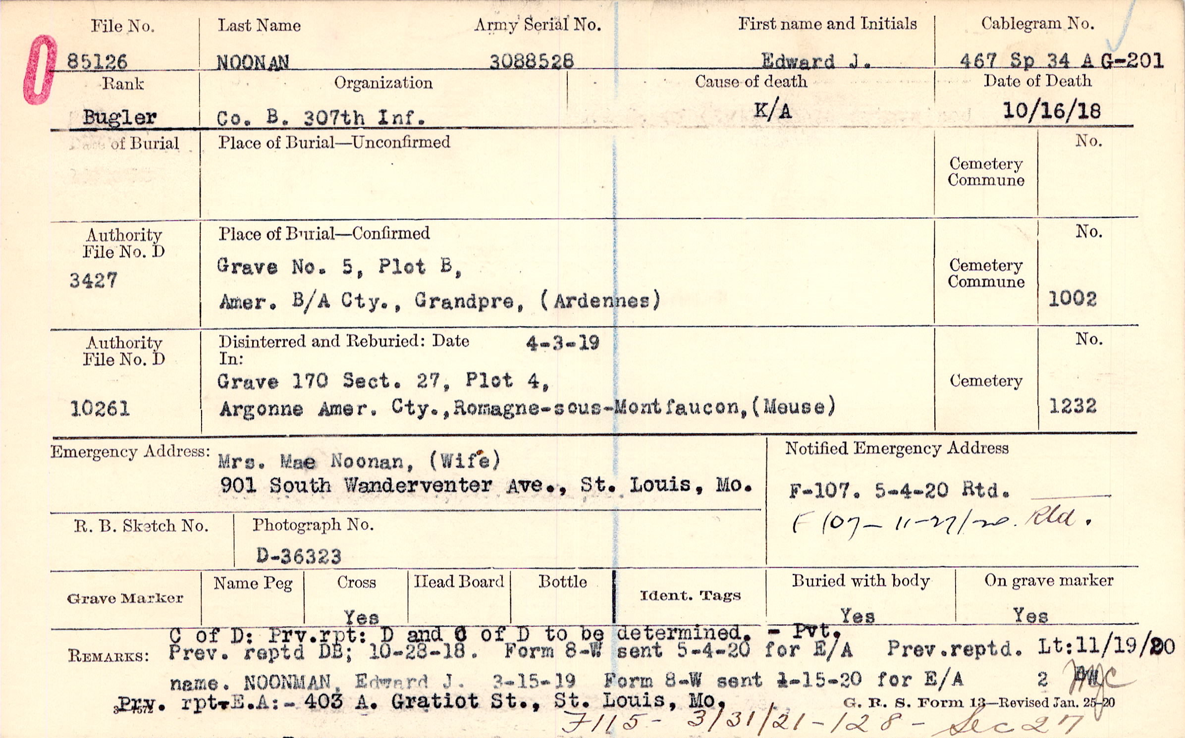Mrs. Mae Noonan, (Wife), 901 South Wanderventer Ave., St. Louis, Mo., C of D: Prv.rpt: D and C of D to be determined, Pvt. Prev. Reptd DB: 10-28. Form 8-W sent 5-4-20 for E/A Prev.Reptd. Lt:11/19/20 name NOONMAN, Edward J. 3-15-19. Form 8-W sent 1-15-20 for E/A Prv. rpt.E.A.:- 403 A. Gratiot St., St Louis, Mo.