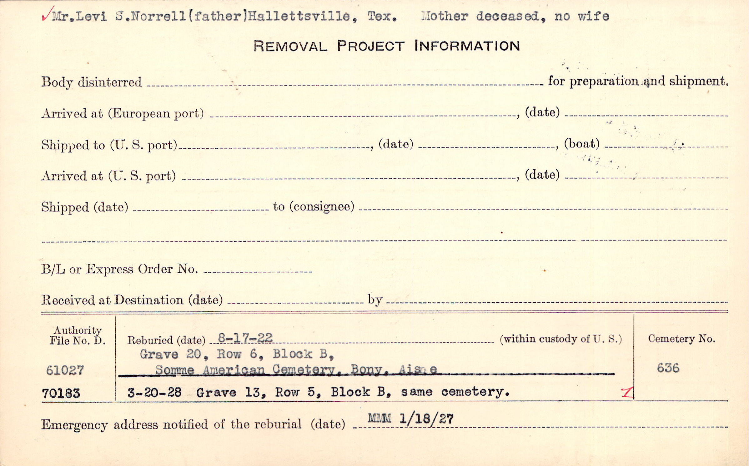 Mr. Levi S. Norrell (father) Hallettsville, Tex. Mother deceased, no wife |