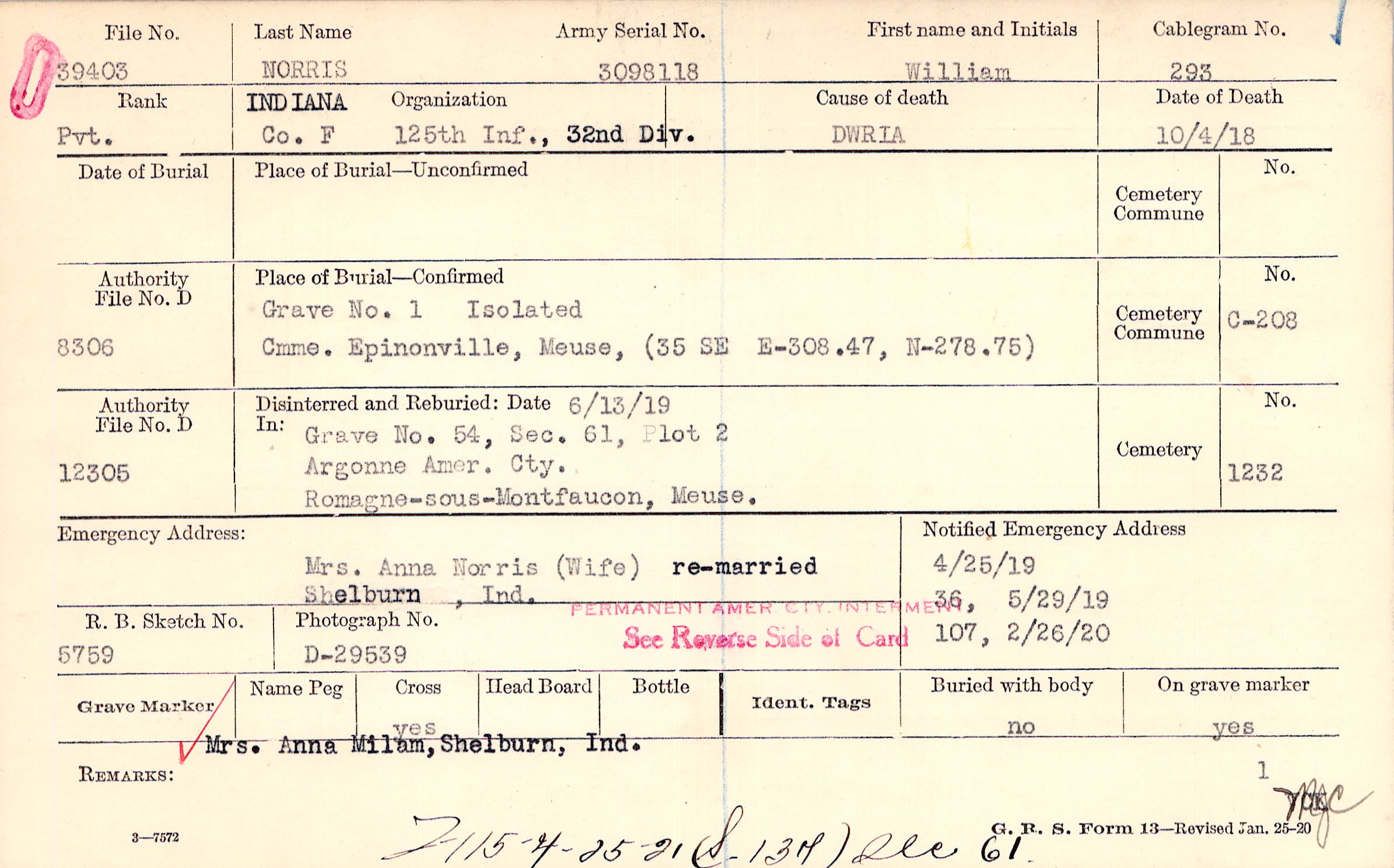 Mrs. Anna Norris (Wife), Shelburn, Ind., re-married