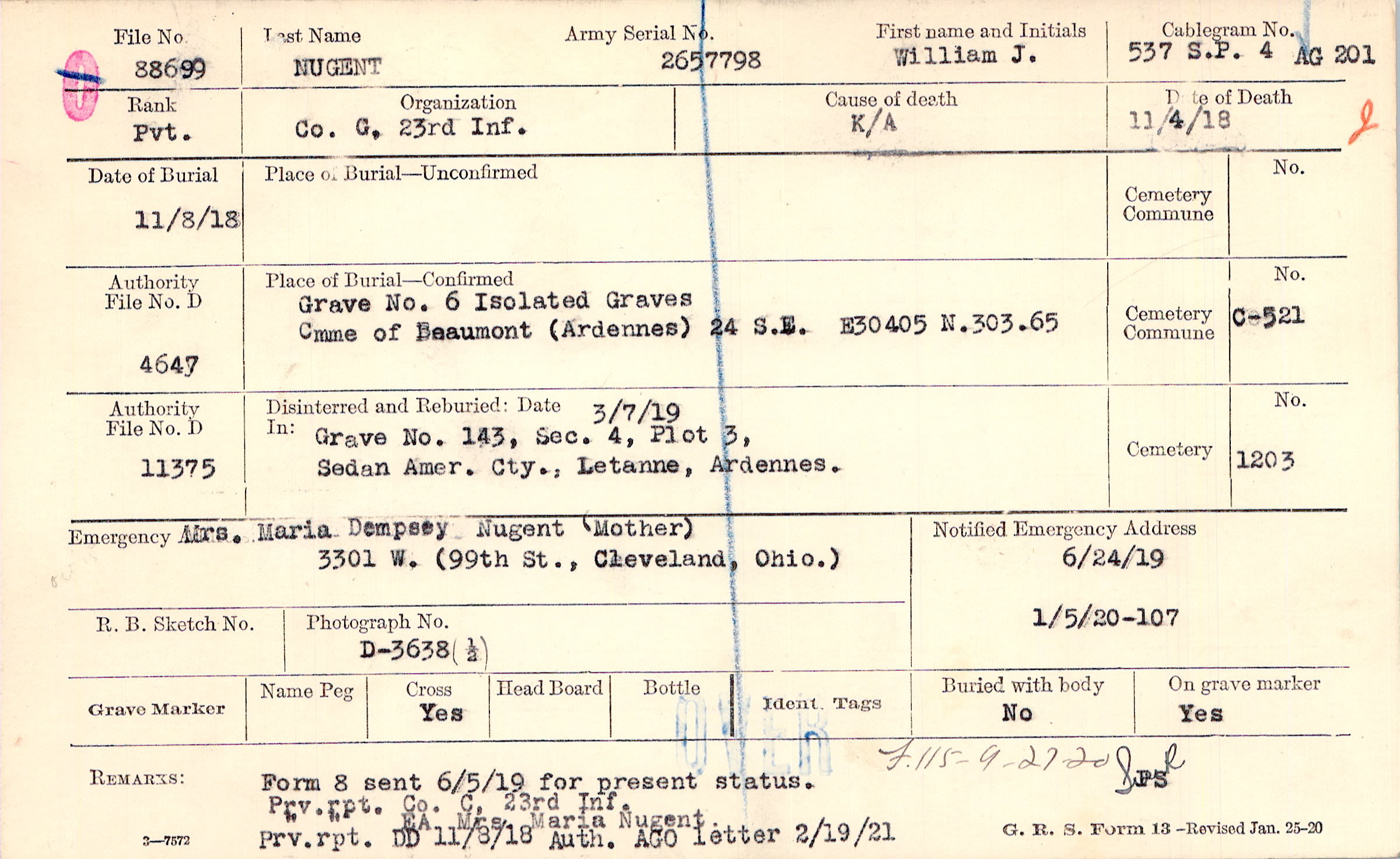 Prv. rpt. Co. C, 23rd Inf. Prv. rpt. EA Mrs. Maria Nugent Prv. rpt. DD 11/8/18 Auth. AGO letter 2/19/21, Form 8 sent 6/5/19 for present status