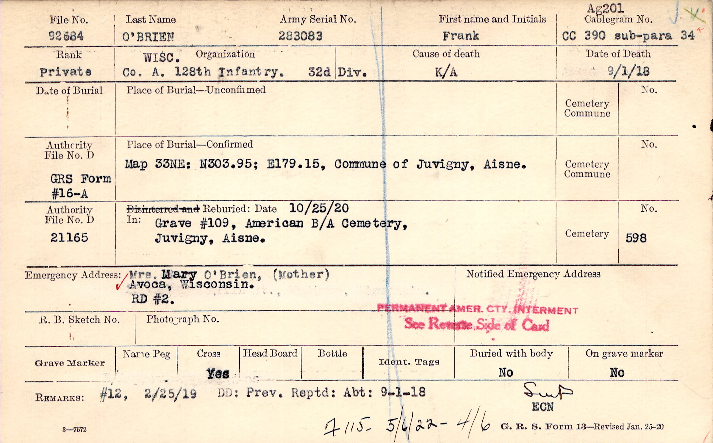 Grave 109, American B/A Cemetery, Juvigny, Aisne