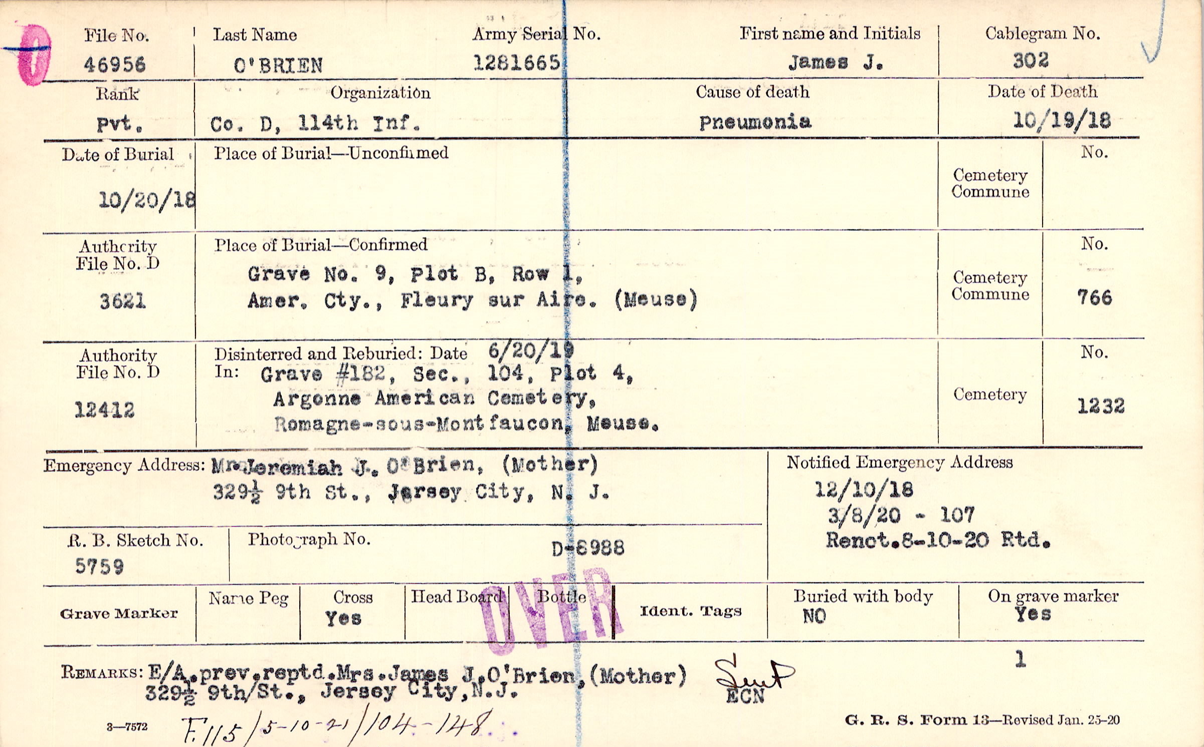 Mr. Jeremiah J. O'Brien, (Mother), 329 1/2 9th St., Jersey City, N.J.