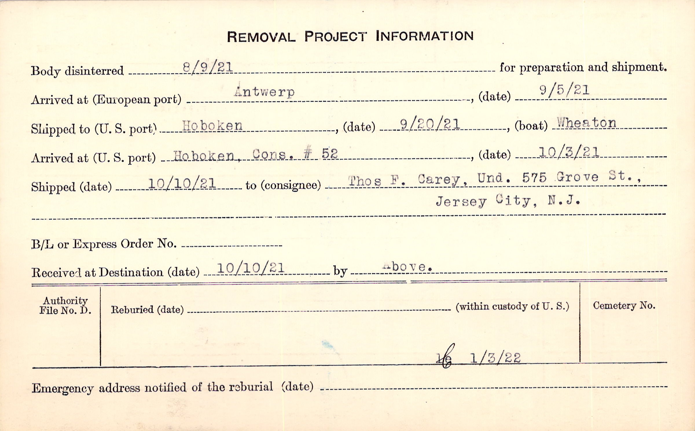 Body disinterred 8/9/1921 for preparation and shipment.