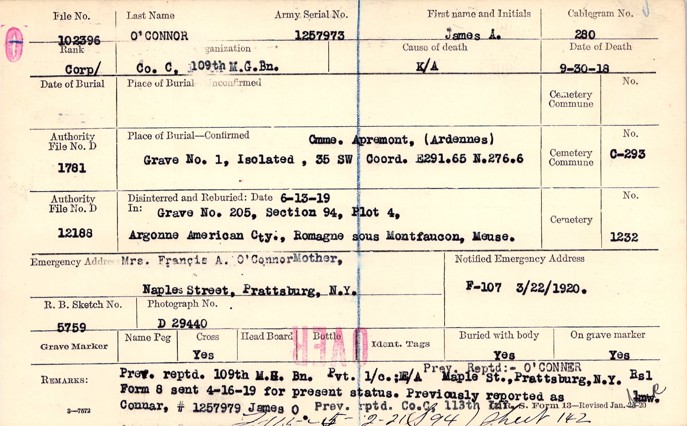 Prev. Reptd:- O'CONNER Prev. reptd. 109th M.H. Bn. Pvt. 1/c. : E/A Maple St., Prattsburg, N.Y. Previously reported as Connar, # 1257979 James O. Prev. rptd. Co. C. 113th Inf., Form 8 sent 4-16-19 for present status., F115 5-2-21, (S 94), Sheet 142