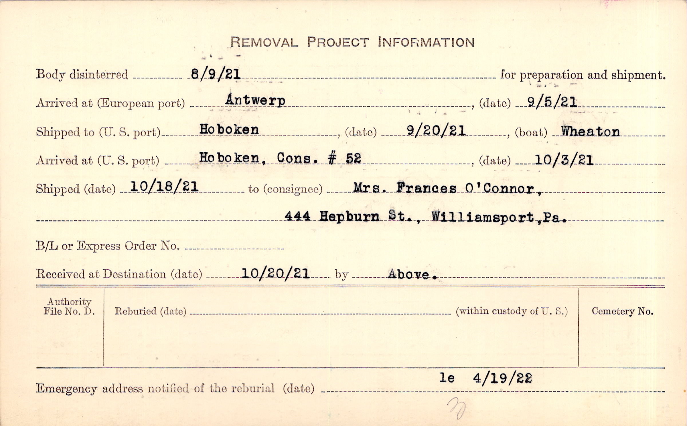 Body disinterred 8/9/1921 for preparation and shipment.