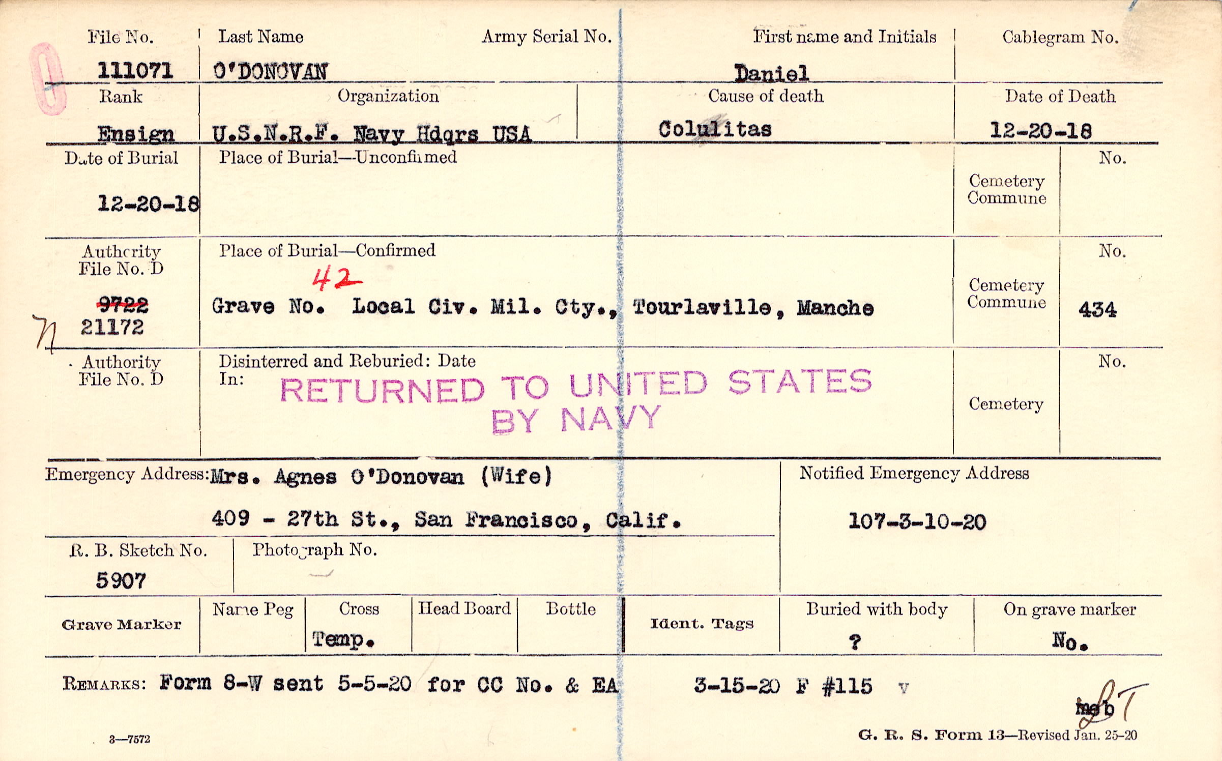 Mrs. Agnes O'Donovan (Wife), 409 - 27th St., San Francisco, Calif.