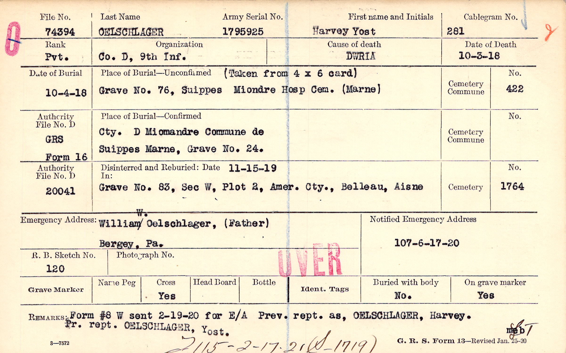 Prev. rept. as, OELSCHLAGER, Harvey. Pr. rept. OELSCHLAGER, Yost., Form #8 W sent 2-19-20 for E/A