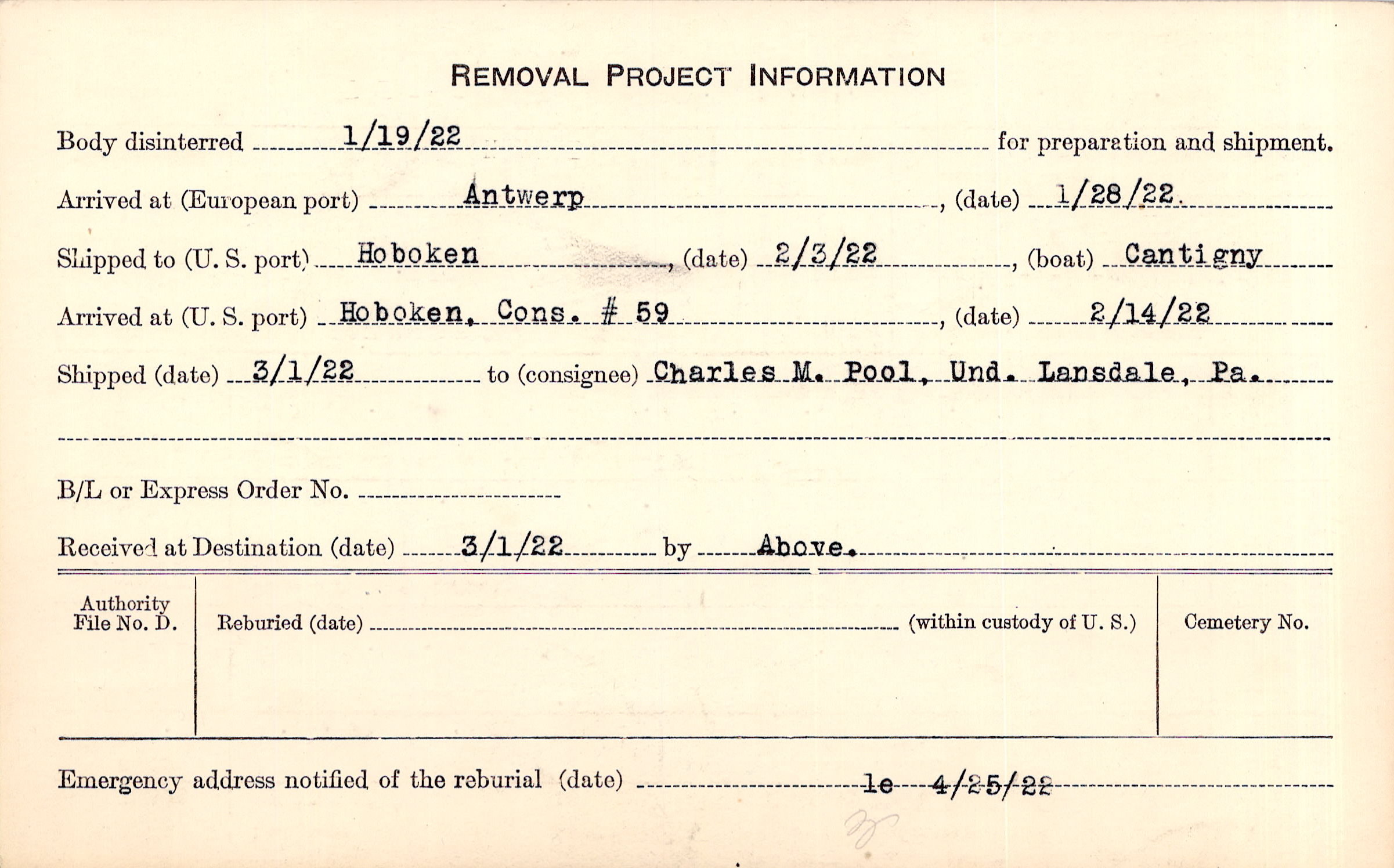 | Emergency address notified on 4/25/1922 |