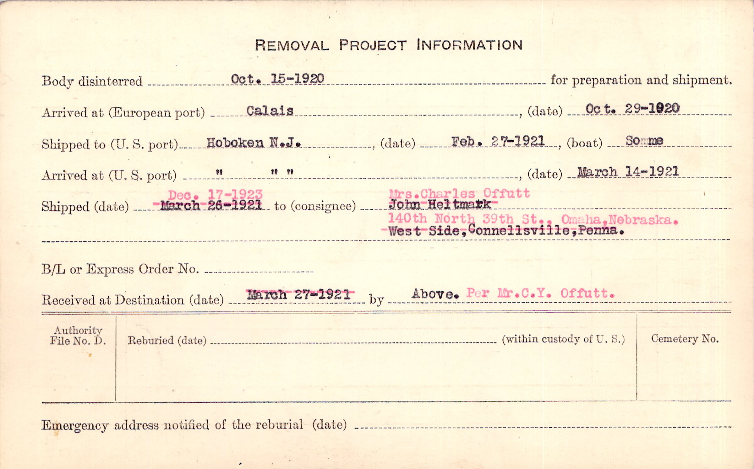 Body disinterred 10/15/1920 for preparation and shipment.