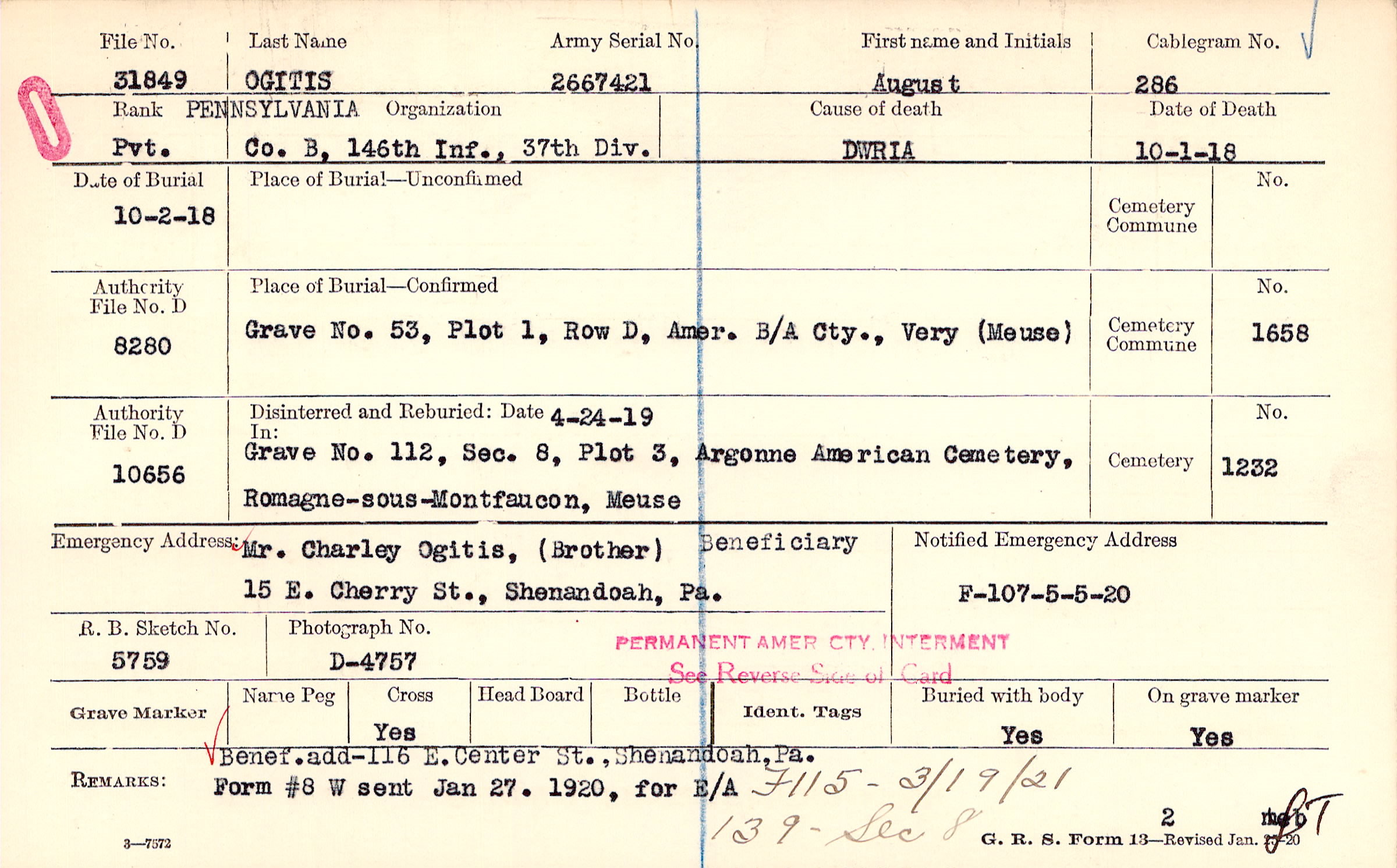 Mr. Charley Ogitis, (Brother), 15 E. Cherry St., Shenandoah, Pa., Beneficiary
