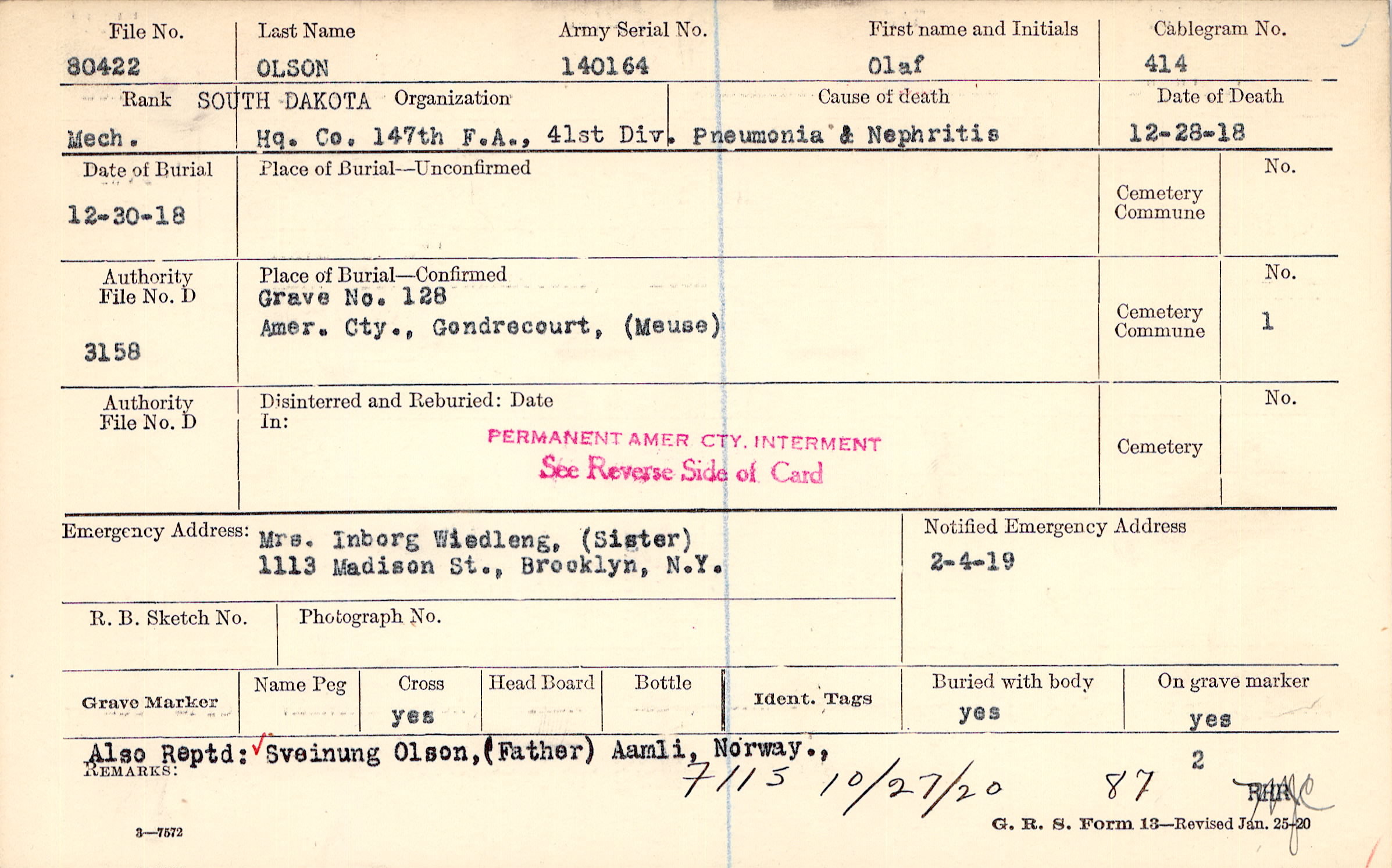 Also Reptd: Sveinung Olson, (Father) Aamli, Norway.,, F115 10/27/20 87