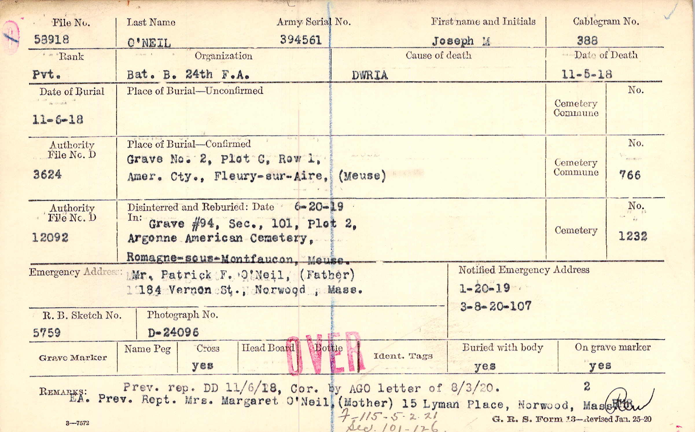 Mr. Patrick F. O'Neil, (Father), 184 Vernon St., Norwood, Mass.