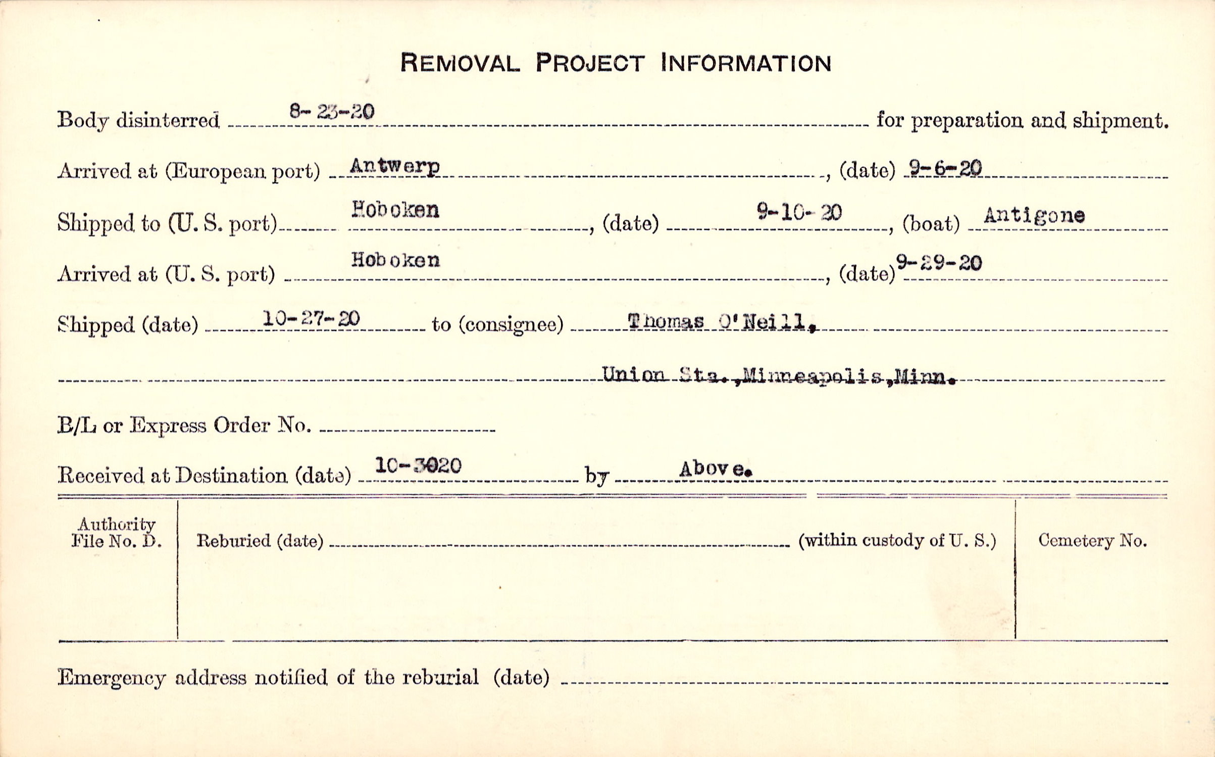 Body disinterred 8/23/1920 for preparation and shipment.