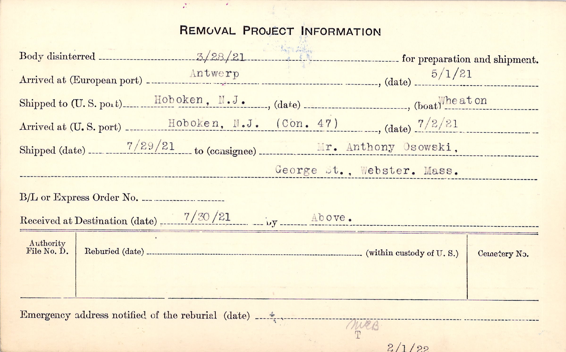Body disinterred 3/28/1921 for preparation and shipment.