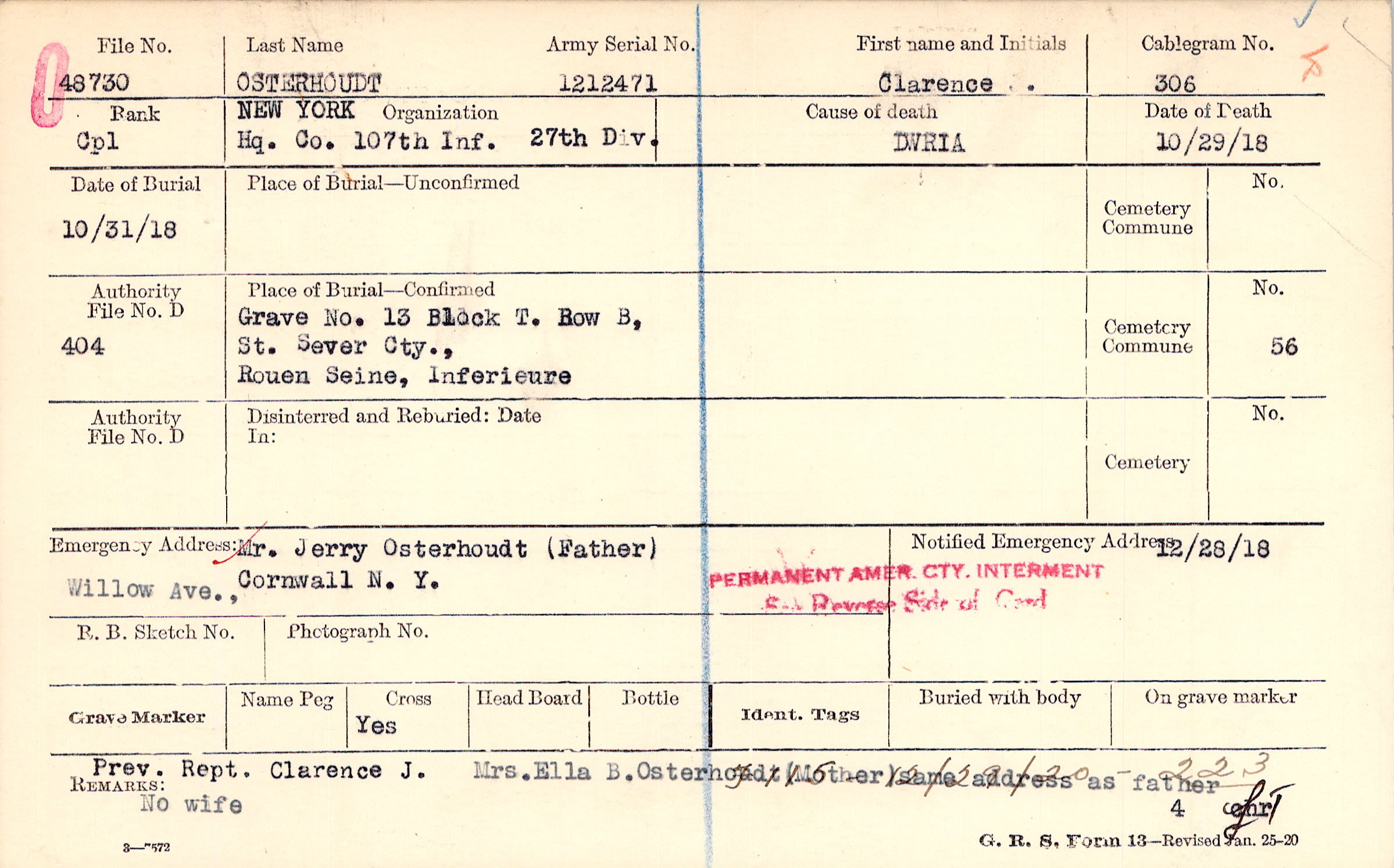 Prev.Rept. Clarence J. Mrs. Ella Osterhoudt (Mother) same address as father. No wife., F115 12/29/20- 223