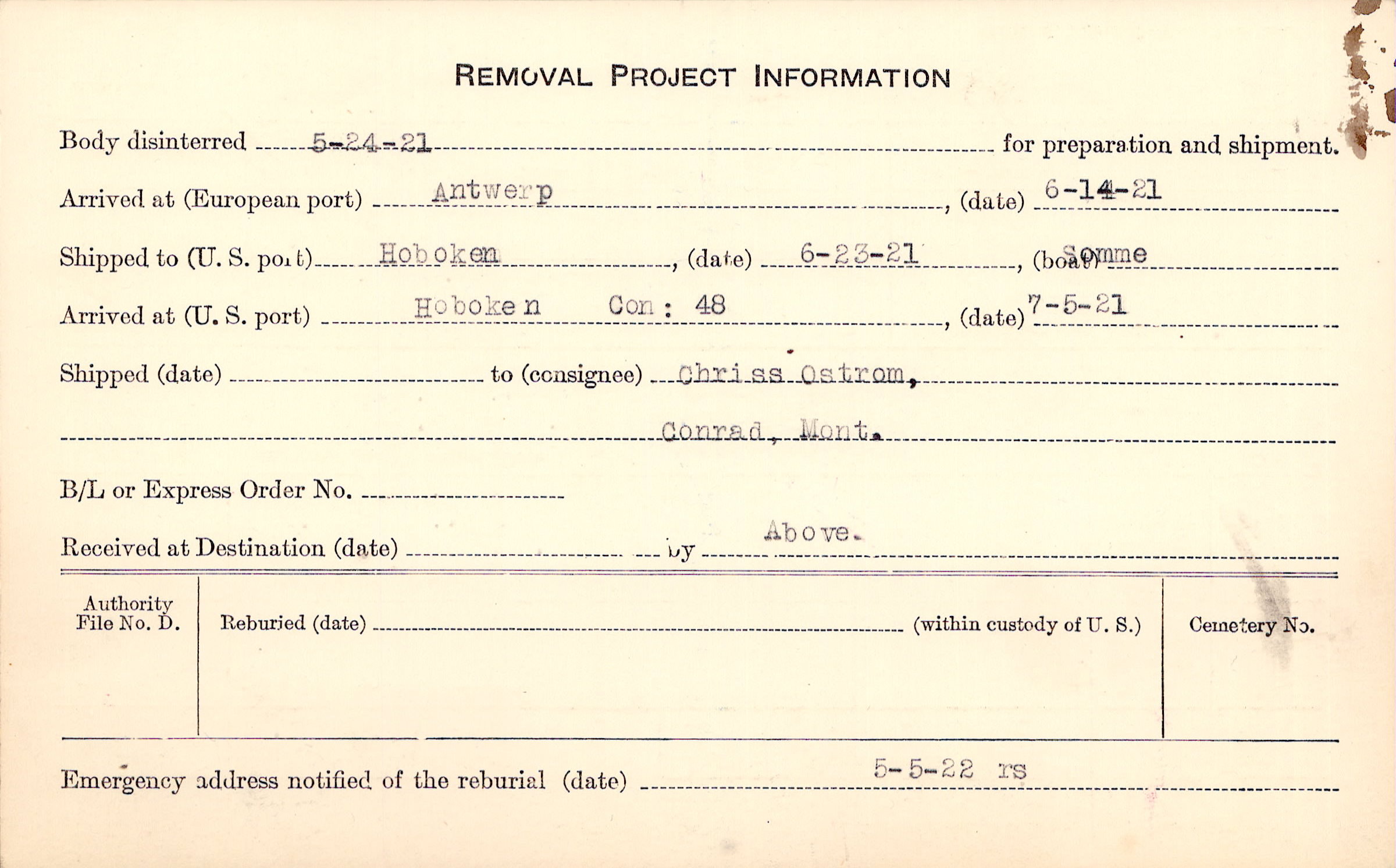 Body disinterred 5/24/1921 for preparation and shipment.