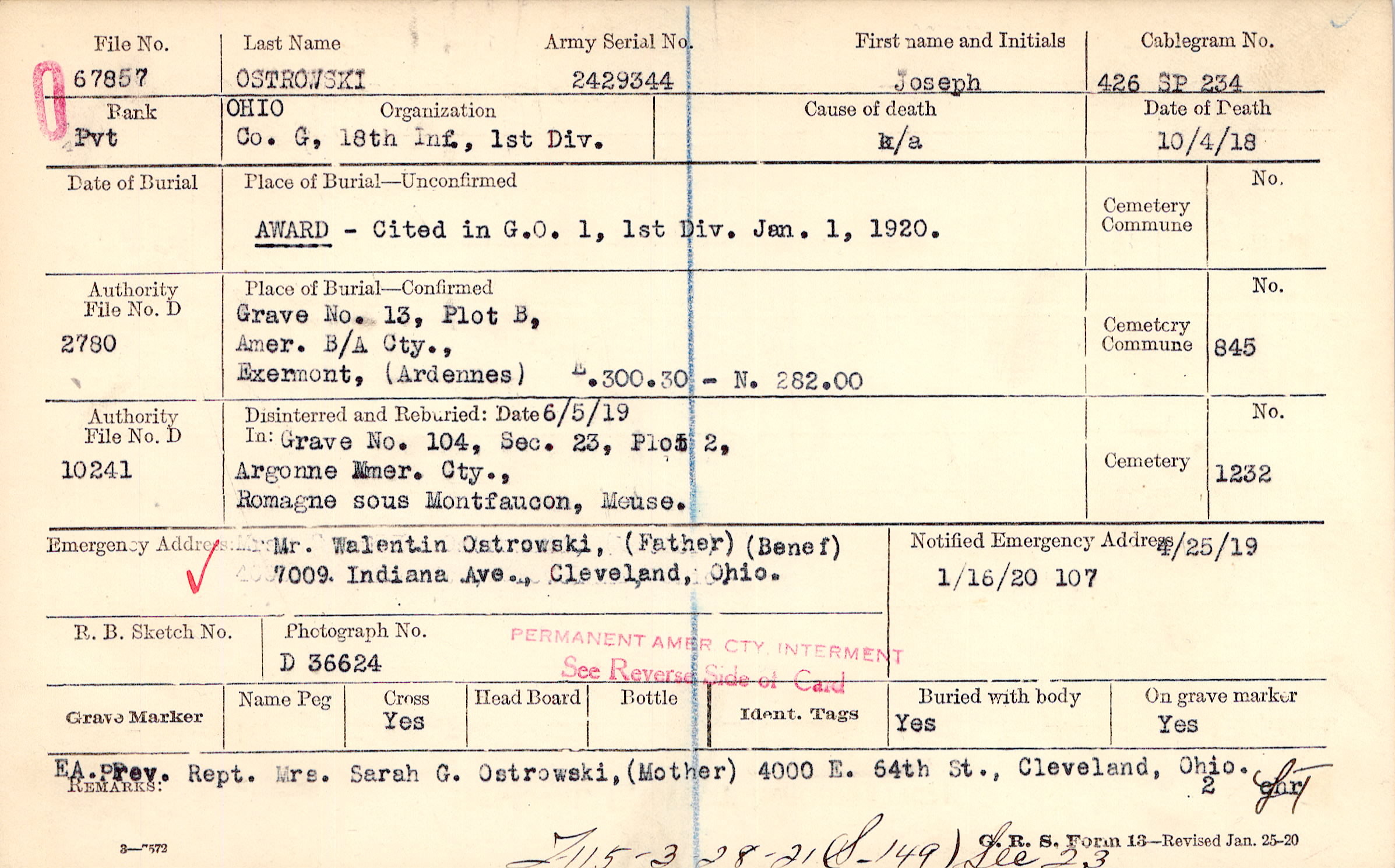 Mr. Walentin Ostrowski, (Father), 7009 Indiana Ave., Cleveland, Ohio., (Benef)
