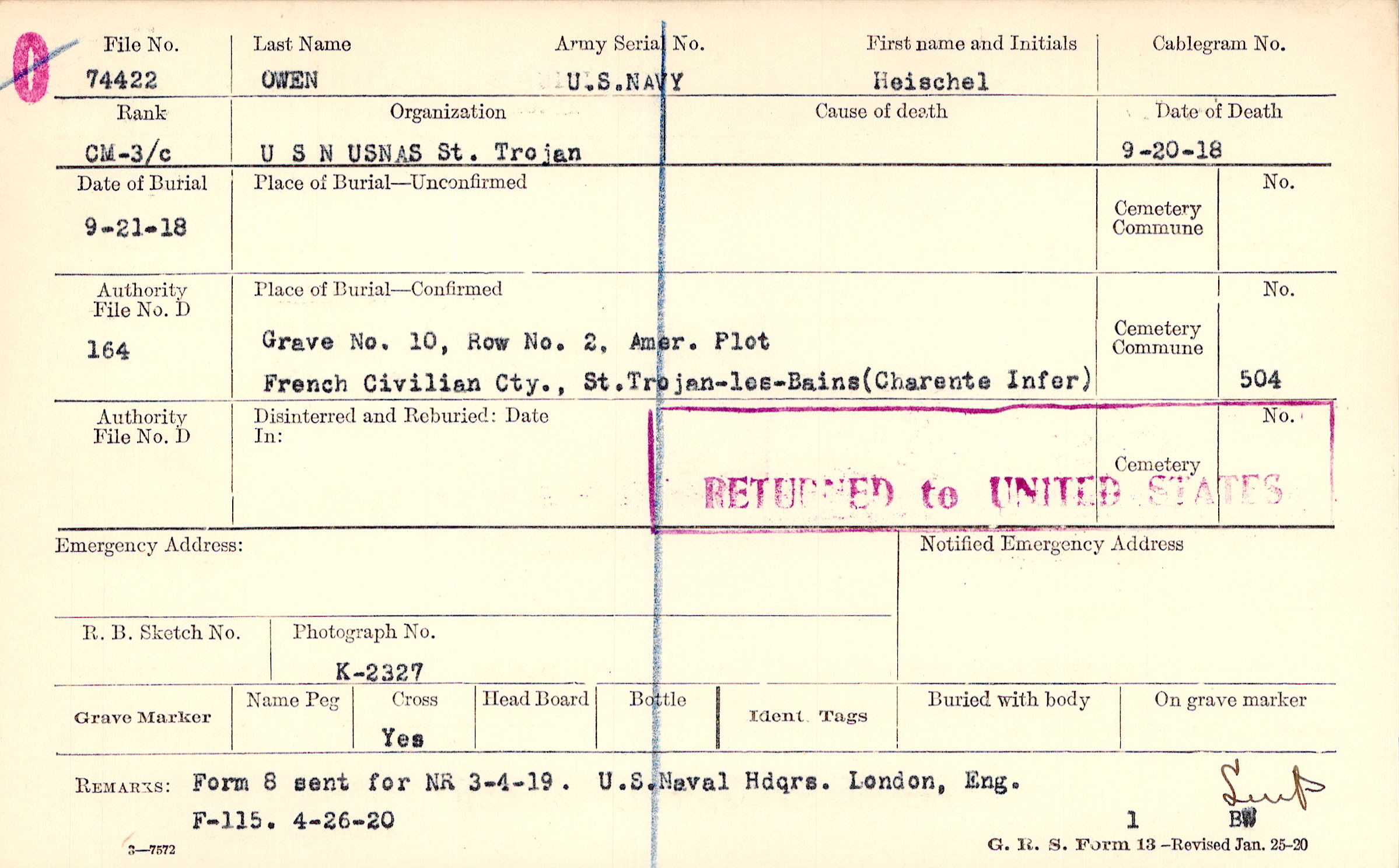 Form 8 sent for NR 3-4-19. U.S. Naval Hdqrs. London, Eng., F-115. 4-26-20