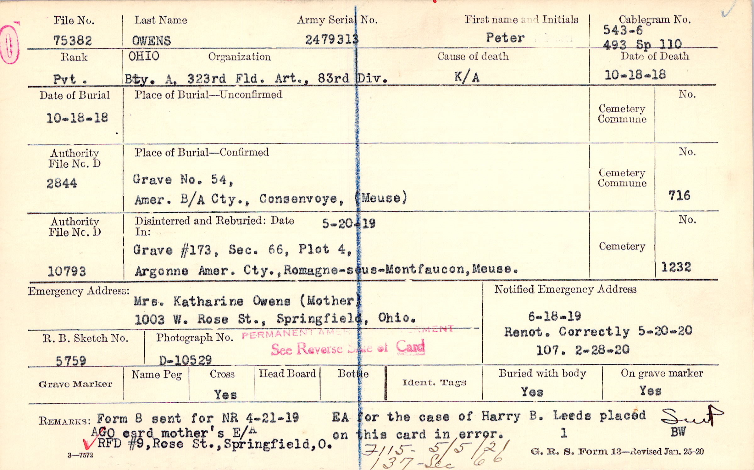 Mrs. Katharine Owens (Mother), 1003 W. Rose St., Springfield, Ohio.