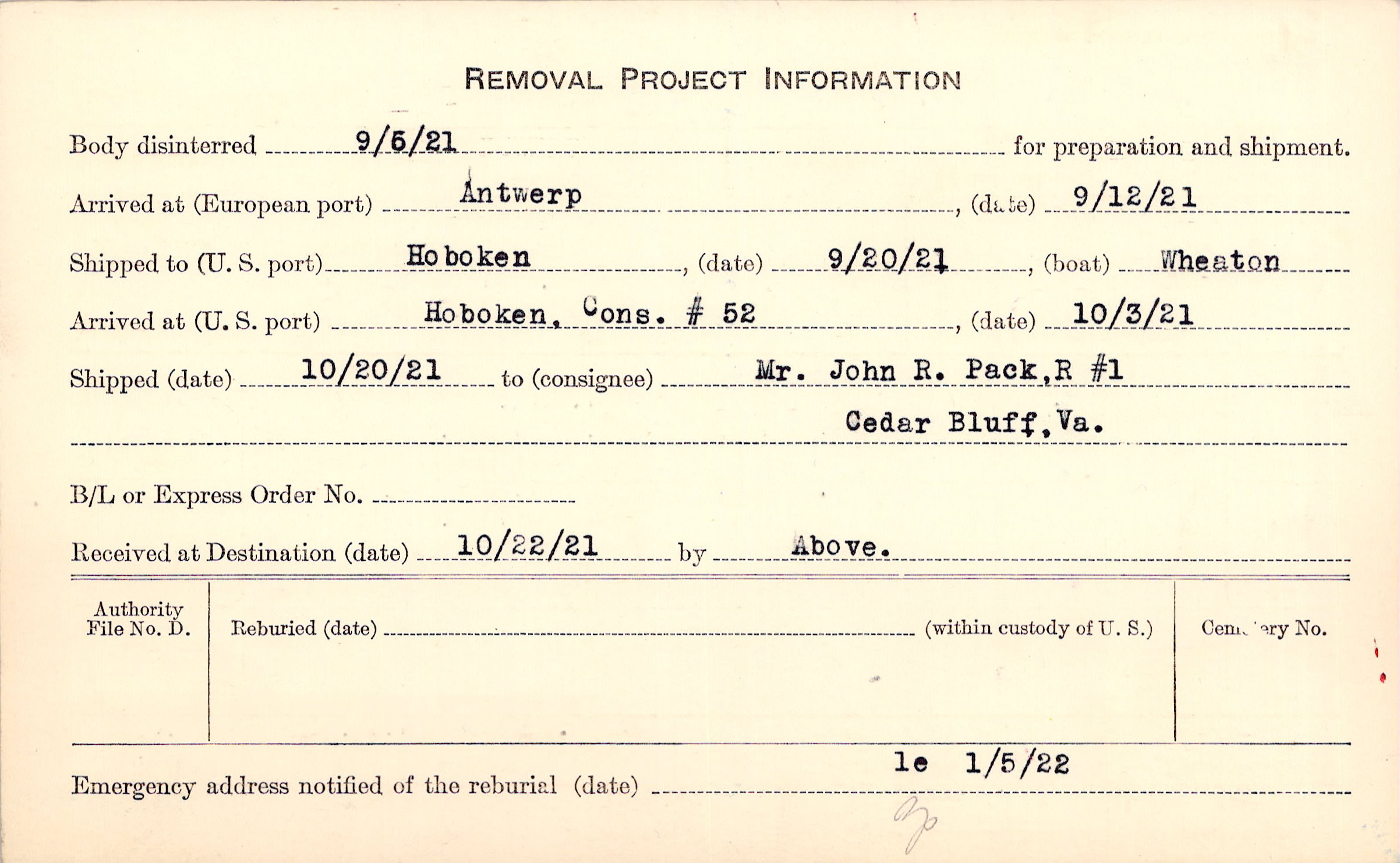 Body disinterred 9/5/1921 for preparation and shipment.