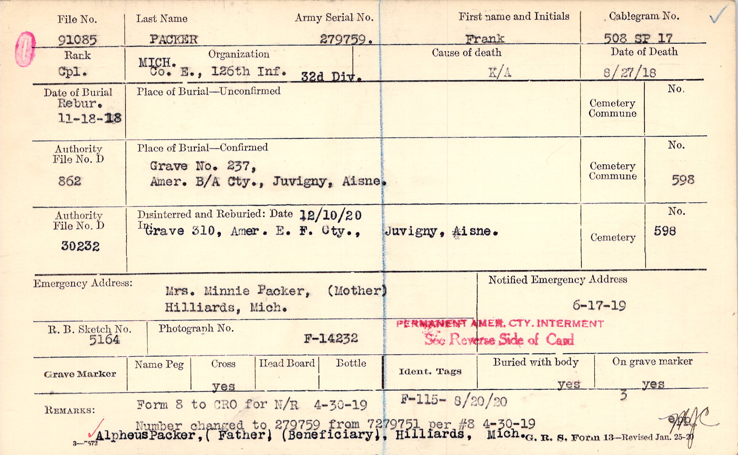 Alpheus Packer, (Father), (Beneficiary), Hilliards, Mich., Form 8 to CRO for N/R 4-30-19 Number changed to 279759 from 7279751 per #8 4-330-19