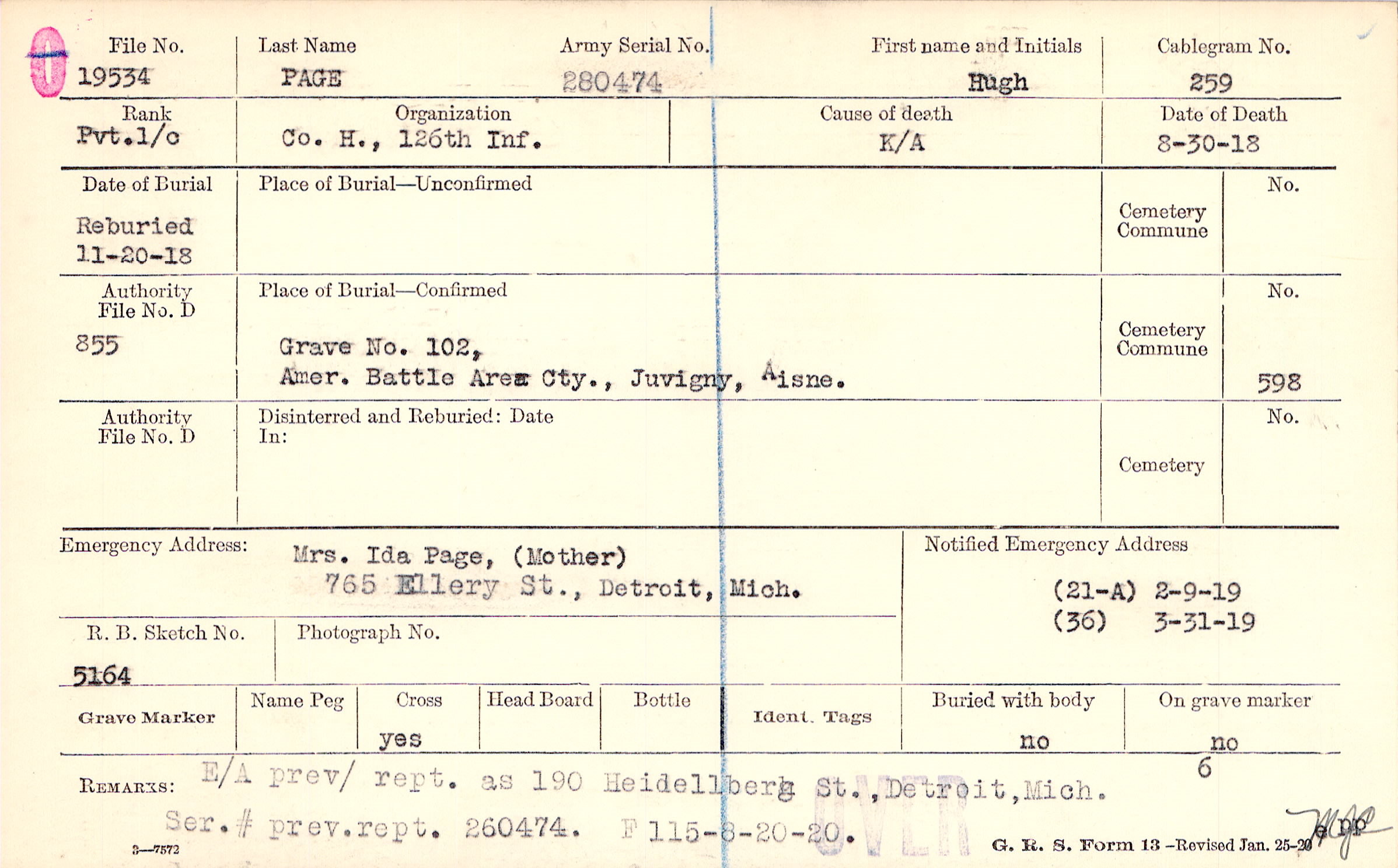 Mrs. Ida Page, (Mother), 765 Ellery St., Detroit, Mich.