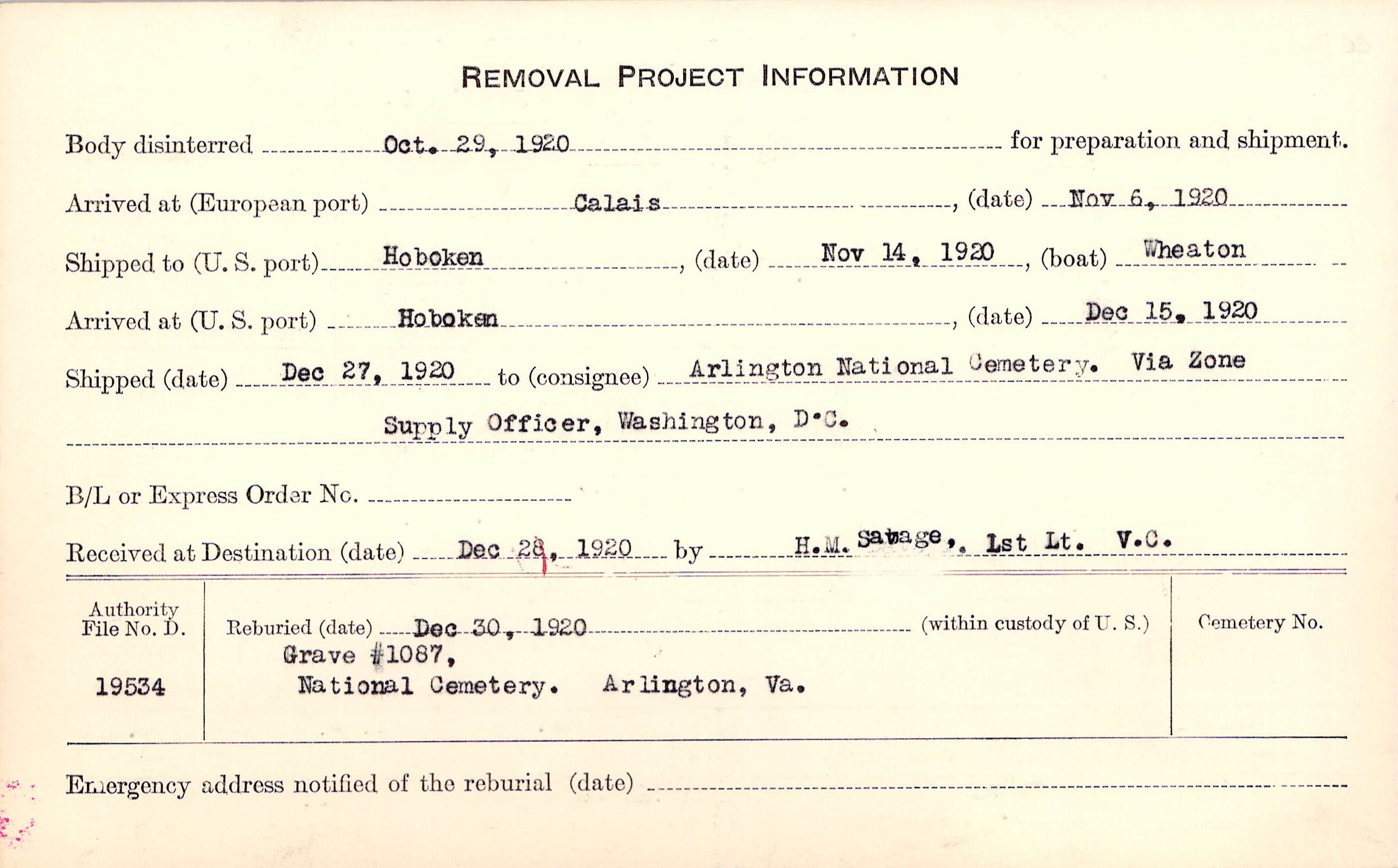 to Arlington National Cemetery, Via Zone Supply Officer, Washington, D. C.