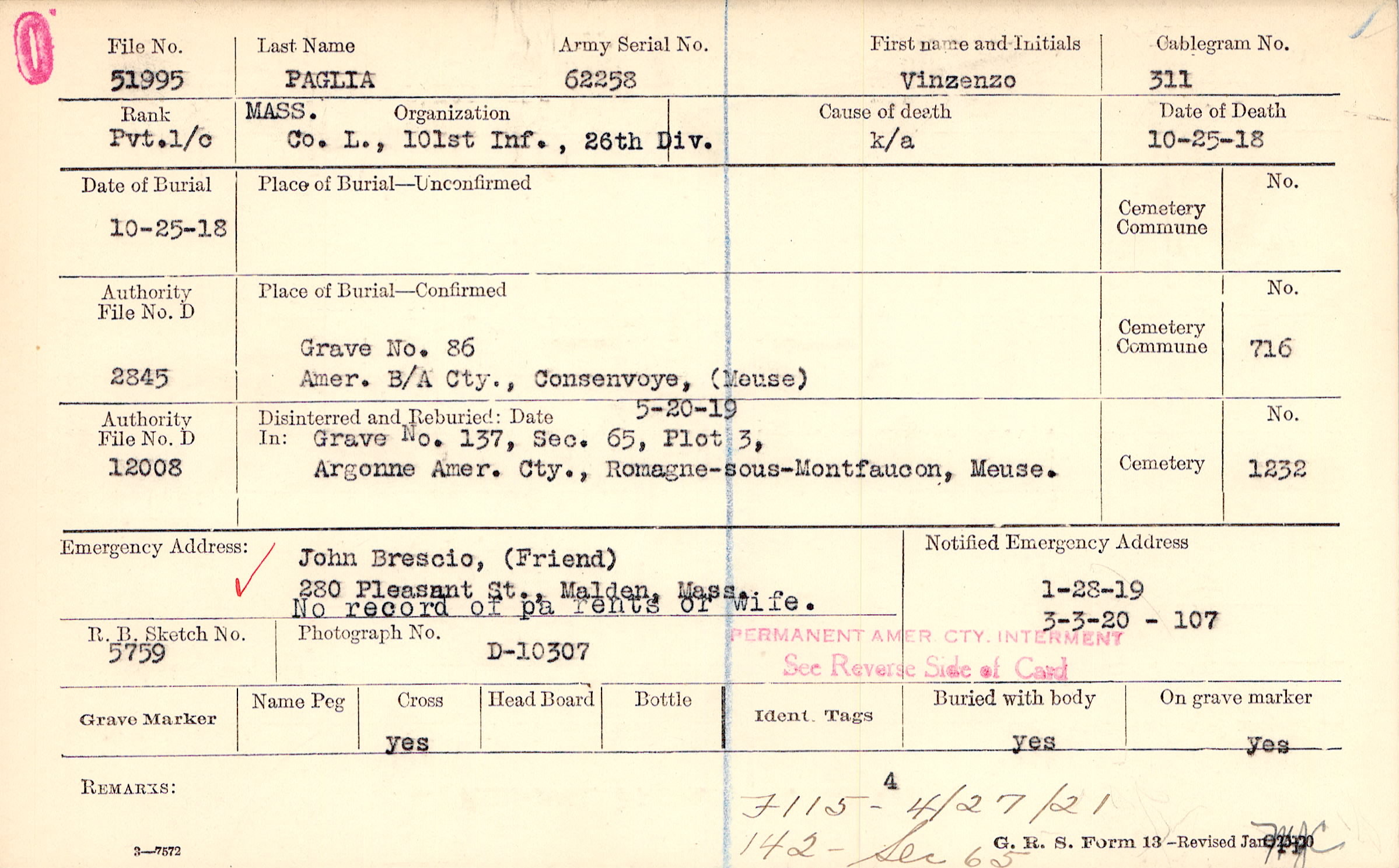 John Brescio, (Friend), 280 Pleasant St., Malden, Mass., No record of parents or wife