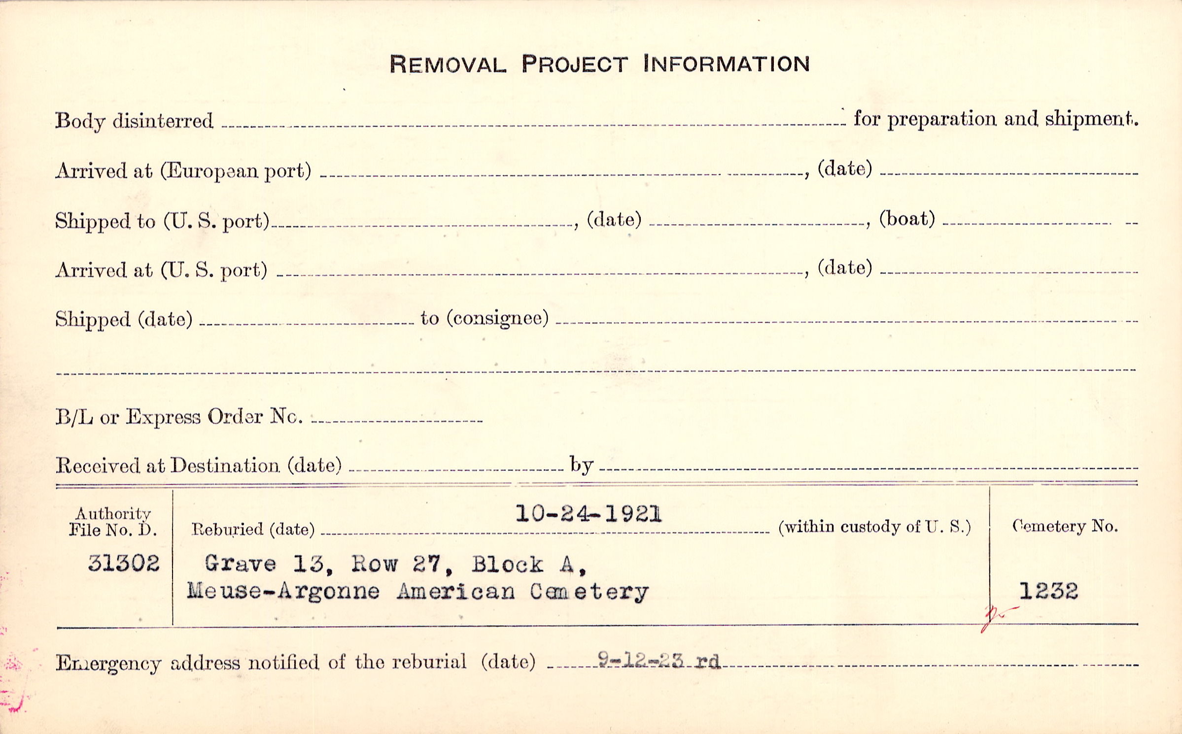 | Permanent Burial in Foreign Cemetery |