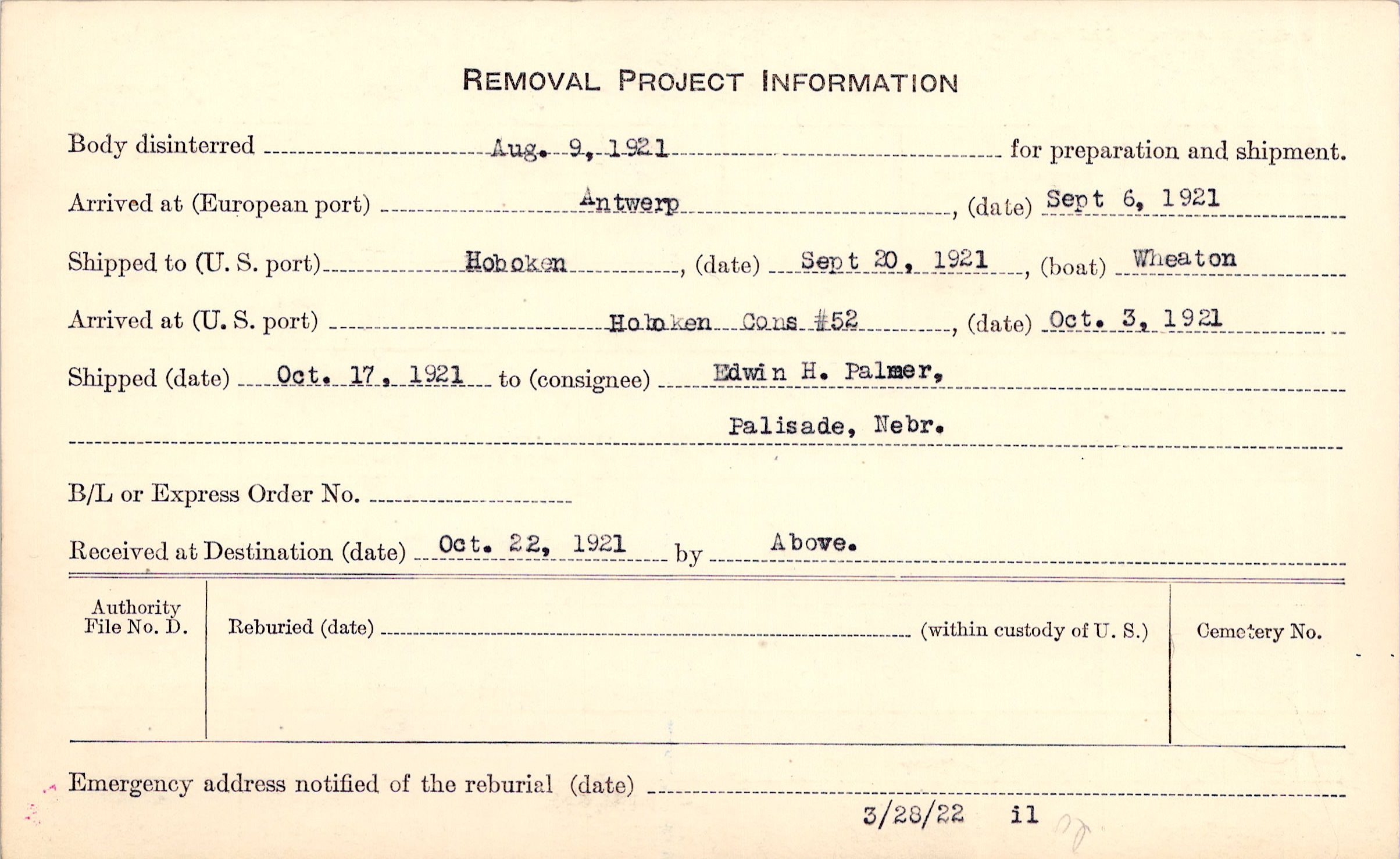 Body disinterred 8/9/1921 for preparation and shipment.
