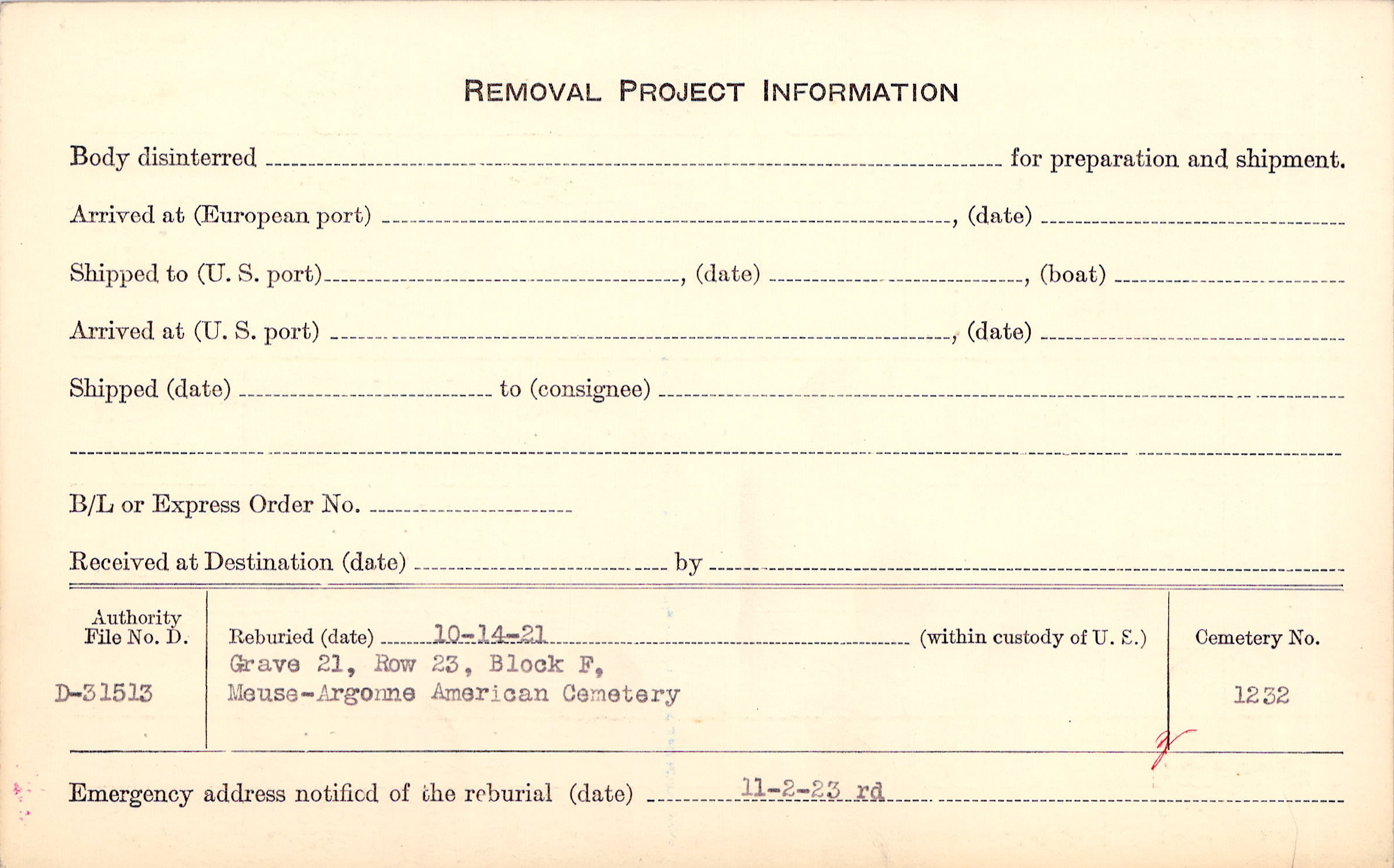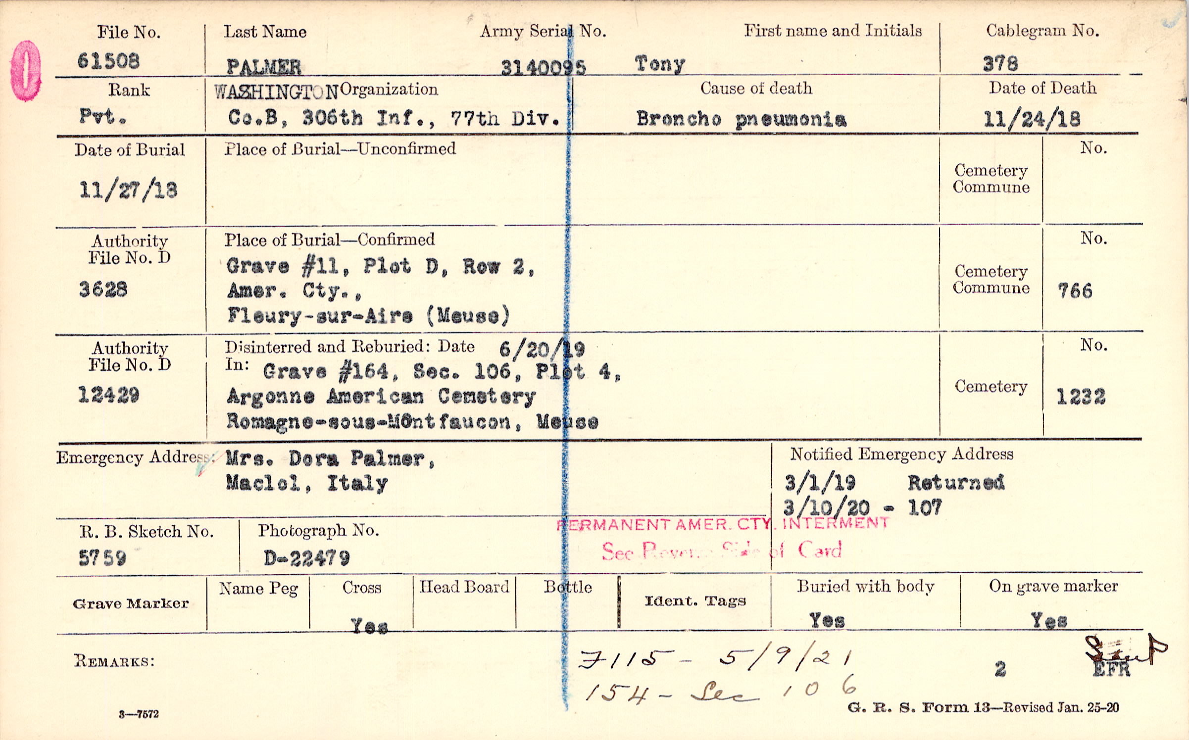 Grave 164, Section 106, Plot 4, Argonne American Cemetery, Romagne-sous-Montfaucon, Meuse