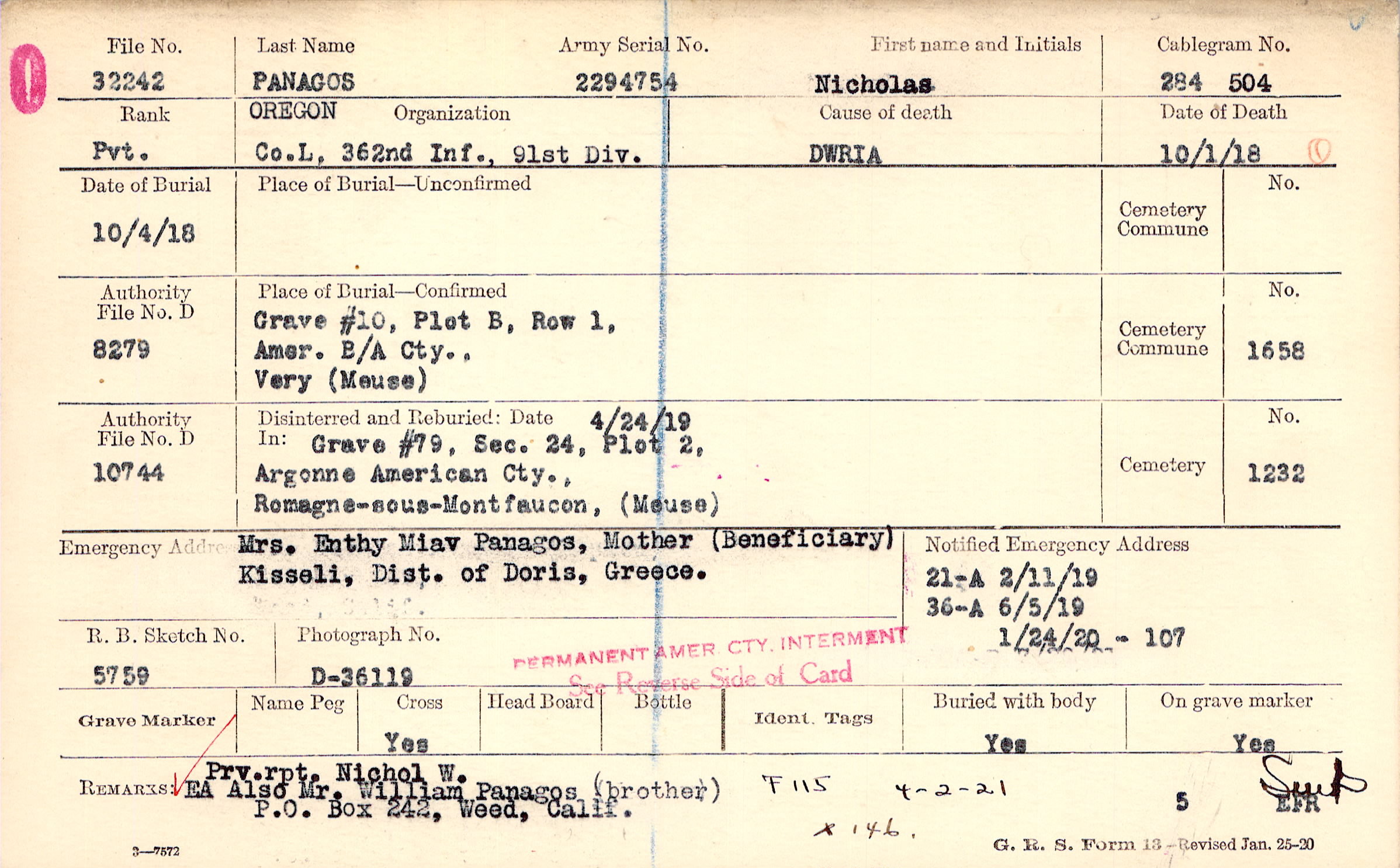 Prv. rpt. Nichol W EA Also Mr. William Panagos (brother) P.). Box 242, Weed, Calif., F115 4-2-21 X 146