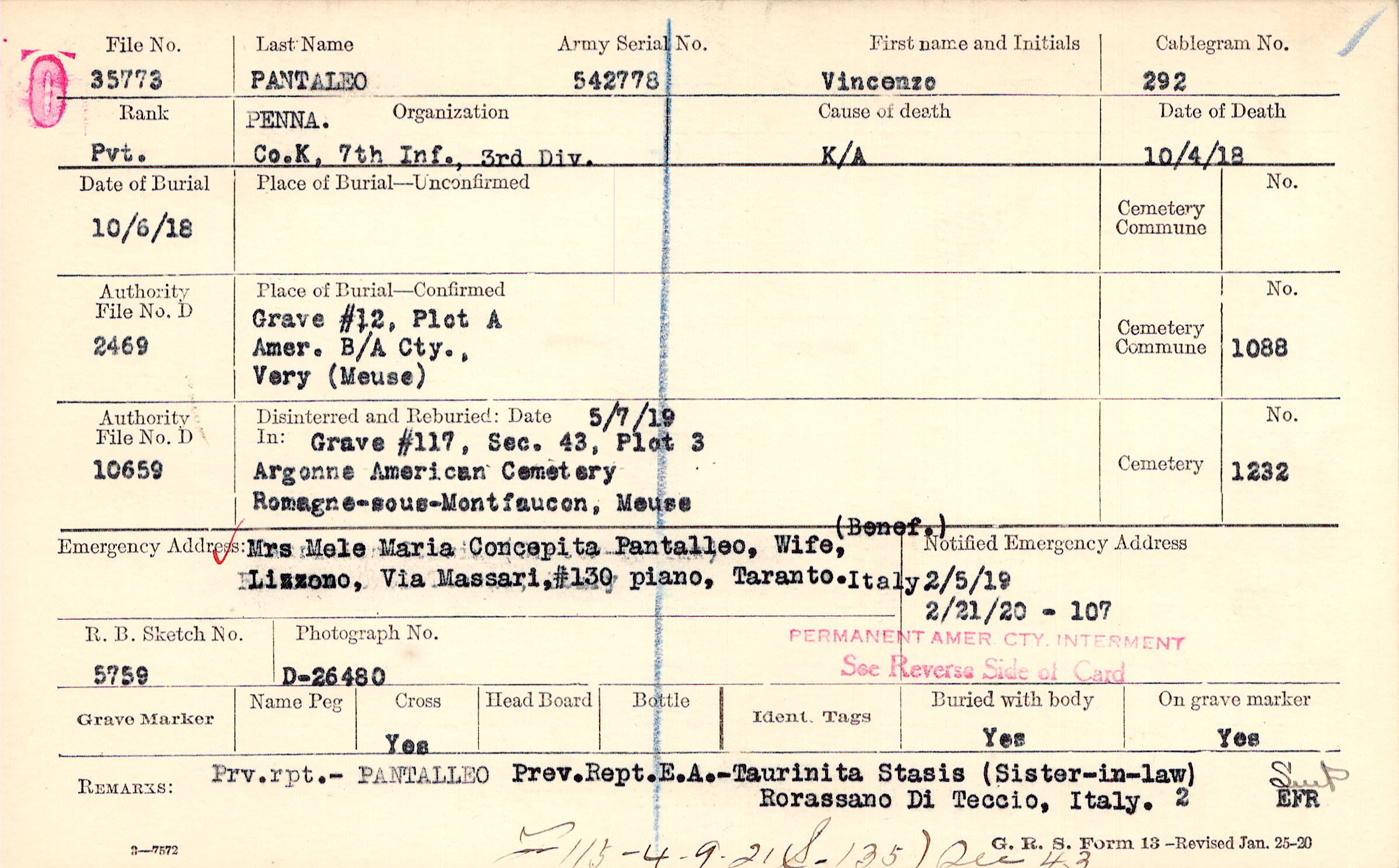 Mrs. Mele Maria Concepita Pantalleo, Wife,, Lizzono, Via Massari, #130 piano, Taranto. Italy, (Benef.)